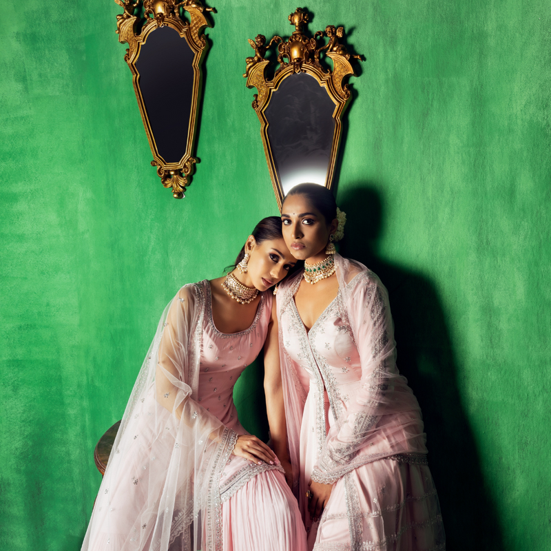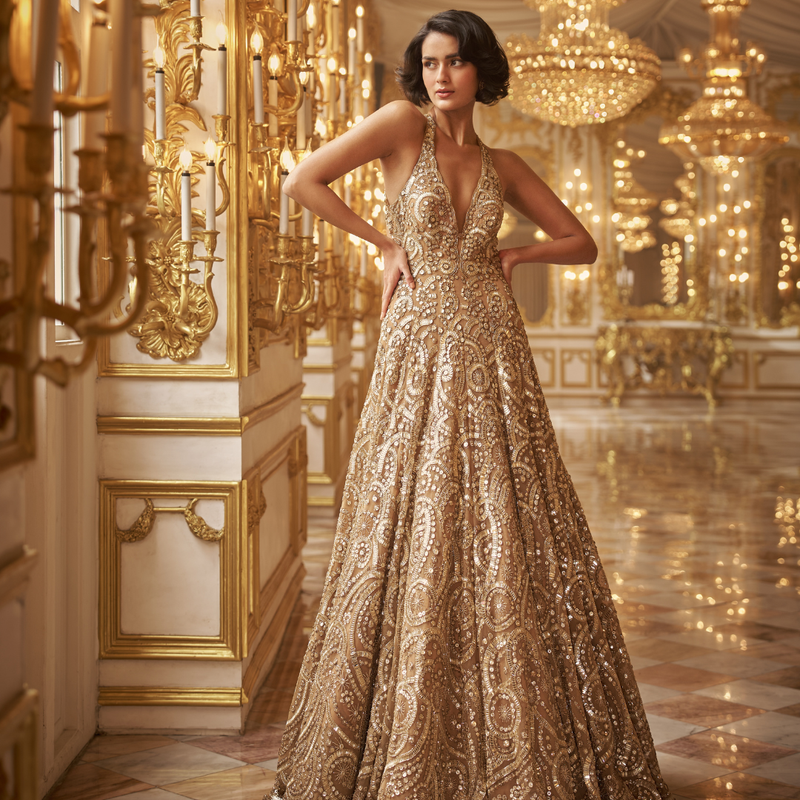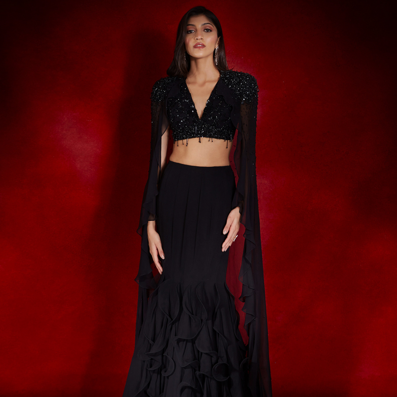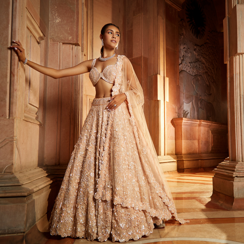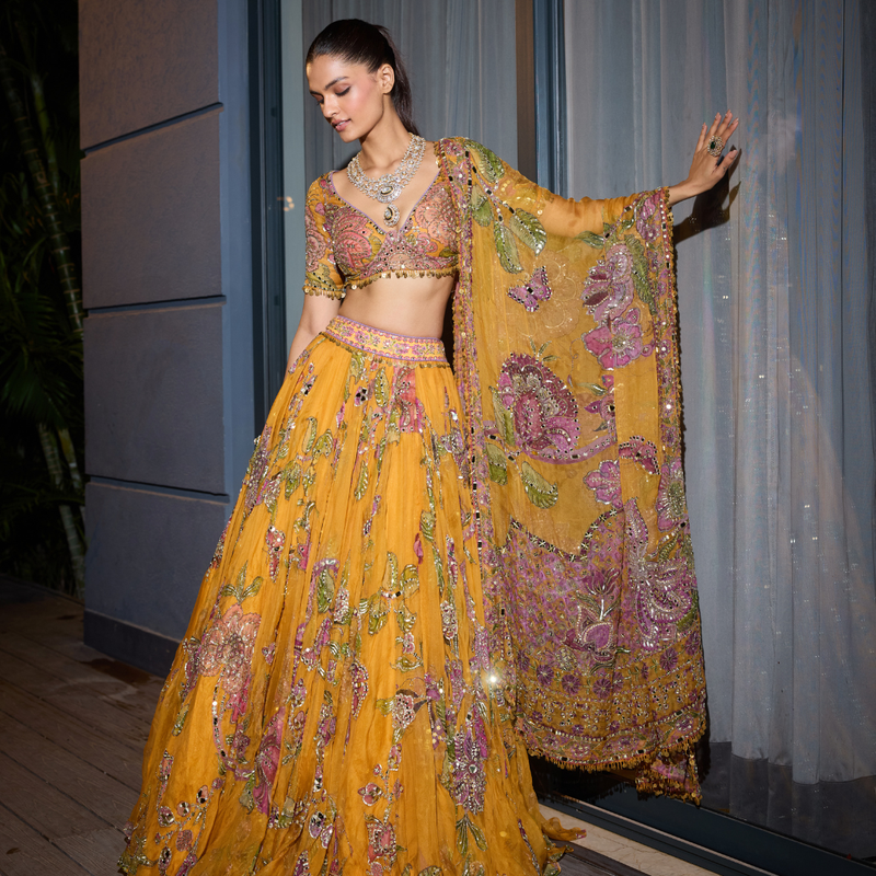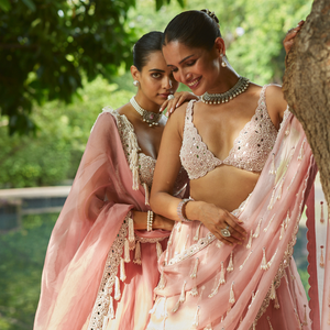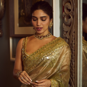 AASTHA SOOD - Leaf green tissue Lehenga with a Draped Halter Blouse