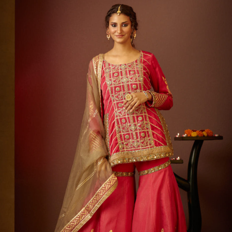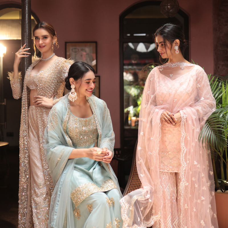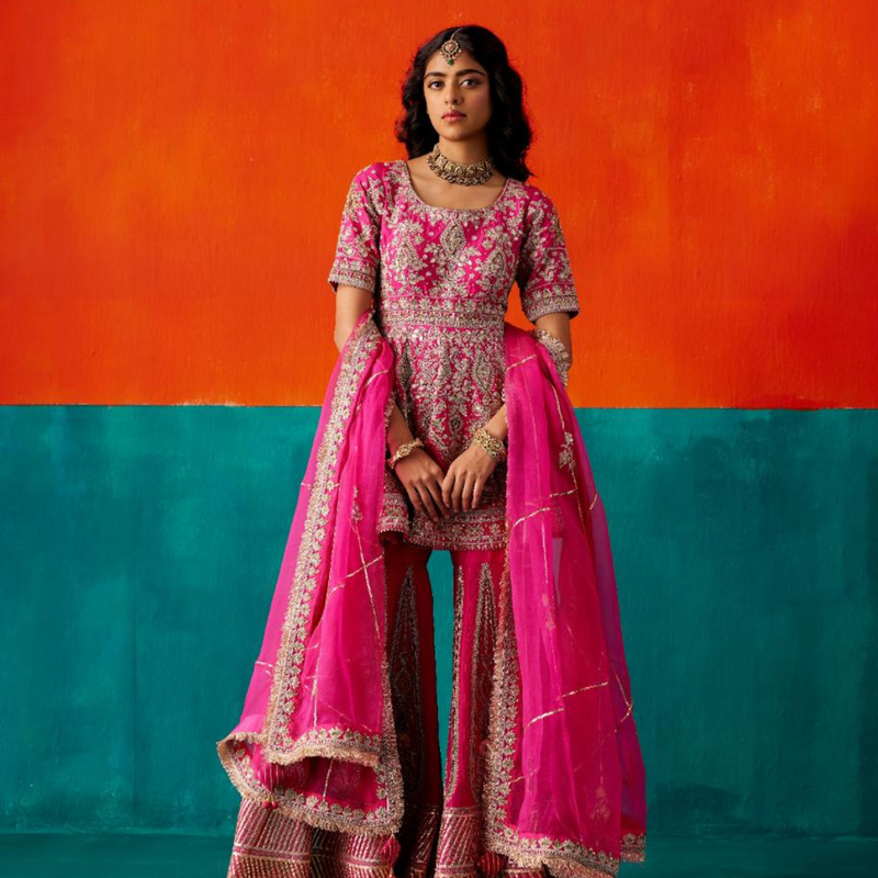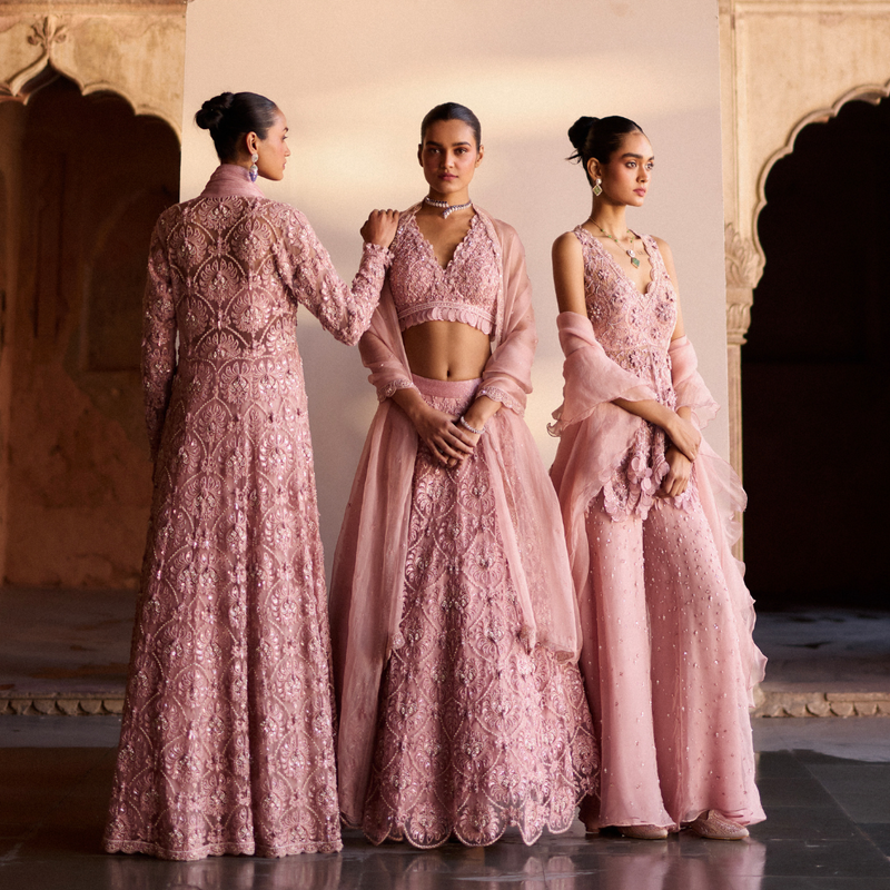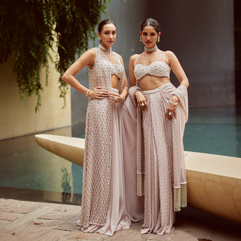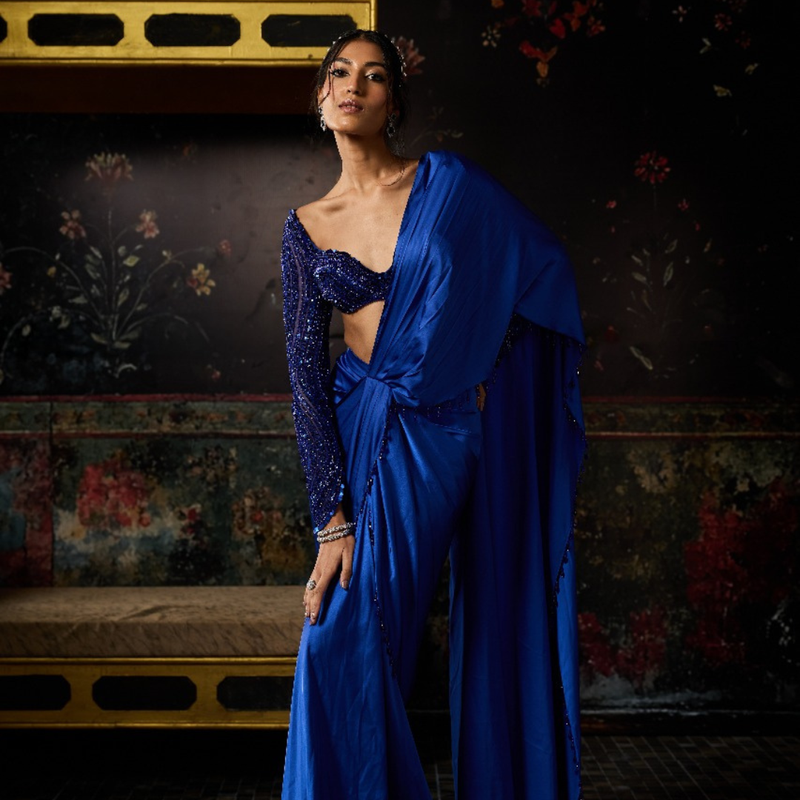 AASTHA SOOD - Aqua Silk Tissue Saree with Pink and Gold Embroidery
