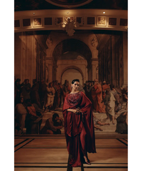 A deep garnet kaftan with languid, layered drapes that frame the body and taper into a sleek, column skirt for statuesque poise. The wide bateau neckline is richly hand-embroidered with tonal sequins, and beads, creating a jeweled yoke. Soft cape sleeves and asymmetric overlays move with ease.