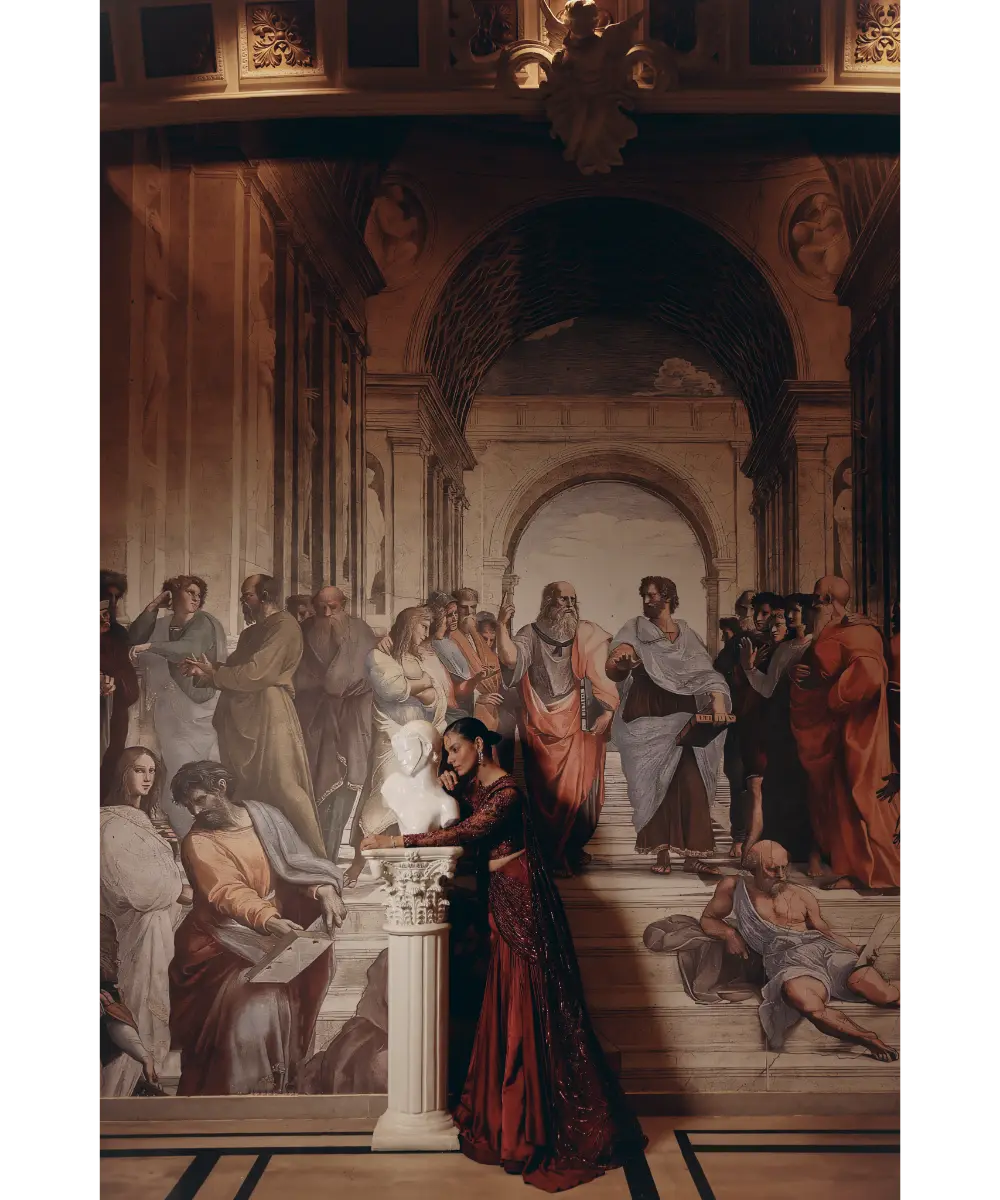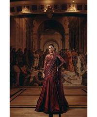 embodies the majesty of timeless couture. The intricately embroidered bodice, adorned with sequins and crystals, flows into a fluid skirt that moves with graceful intensity. Draped panels, layered with shimmer detailing, lend depth and dimension to the silhouette, while full-length sleeves add regal refinement. A perfect balance of strength and elegance, this saree is designed for unforgettable entrances