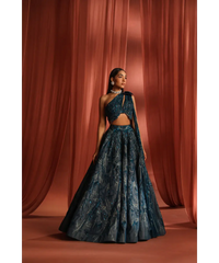 This teal lehenga reimagines modern elegance with its contemporary silhouette and captivating abstract geometric artwork. The one-shoulder blouse, with its modern cut, adds an air of minimalist sophistication, while the dupatta, gently attached at one shoulder, drapes with effortless grace, enhancing the overall fluidity of the look.
