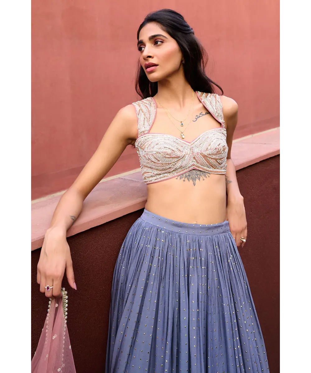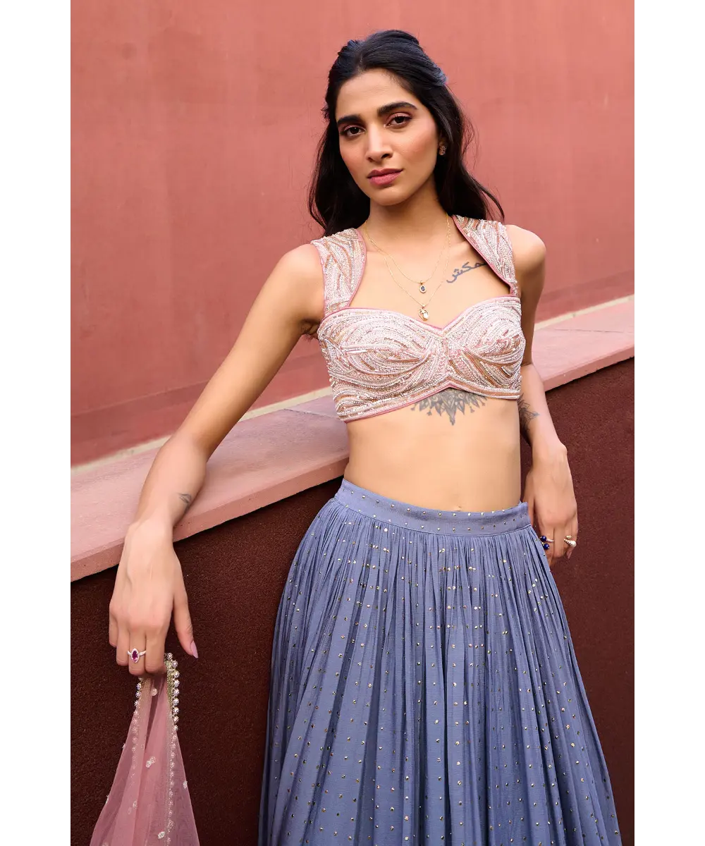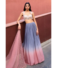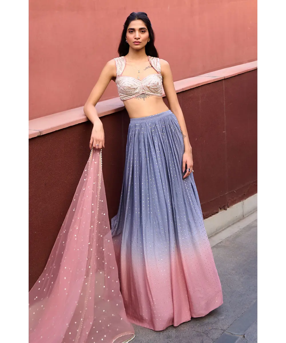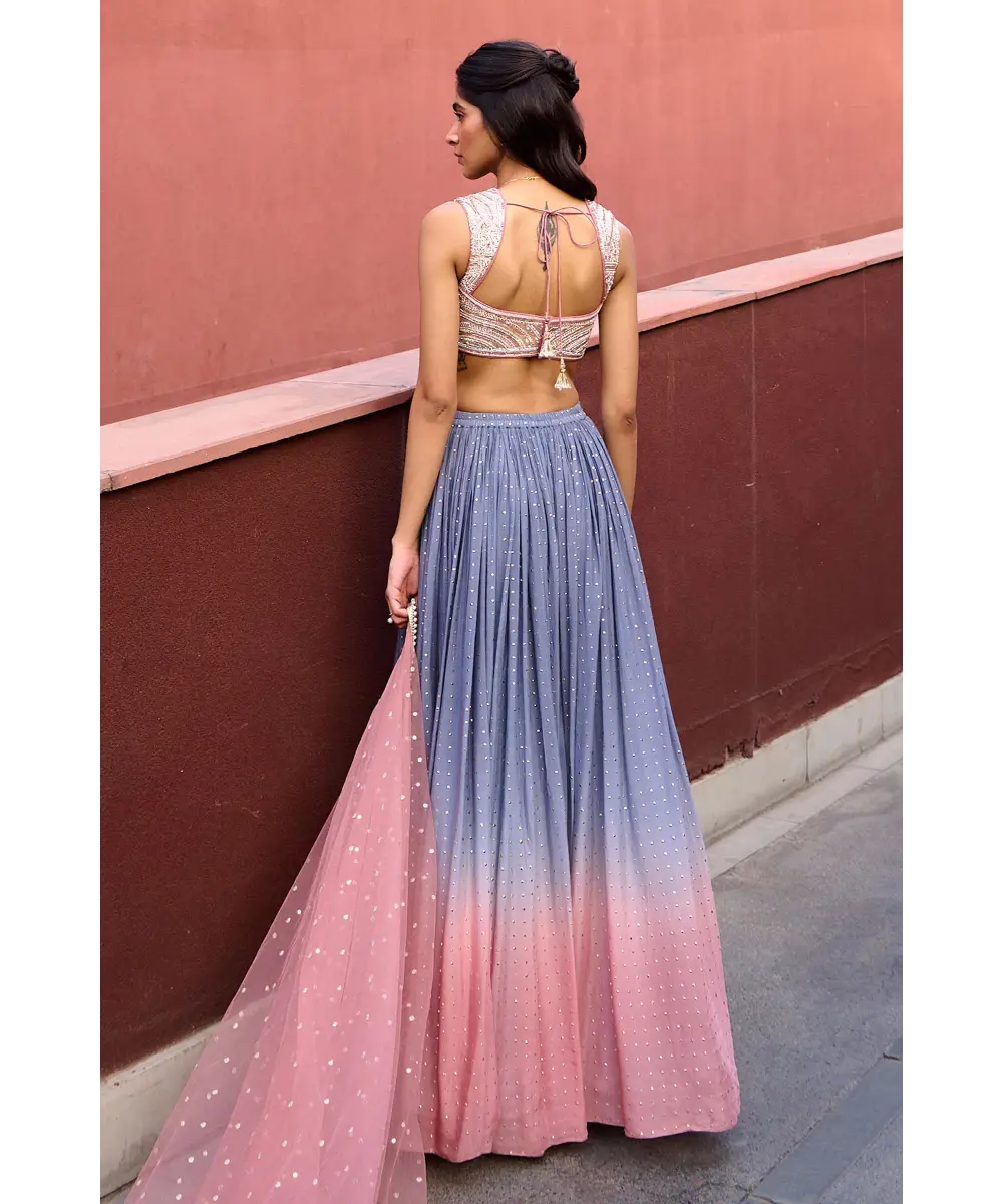 Grey to Mauve Pink Ombre Lehenga paired with mauve pink glass beads glamourous embroidered blouse and tulle dupatta