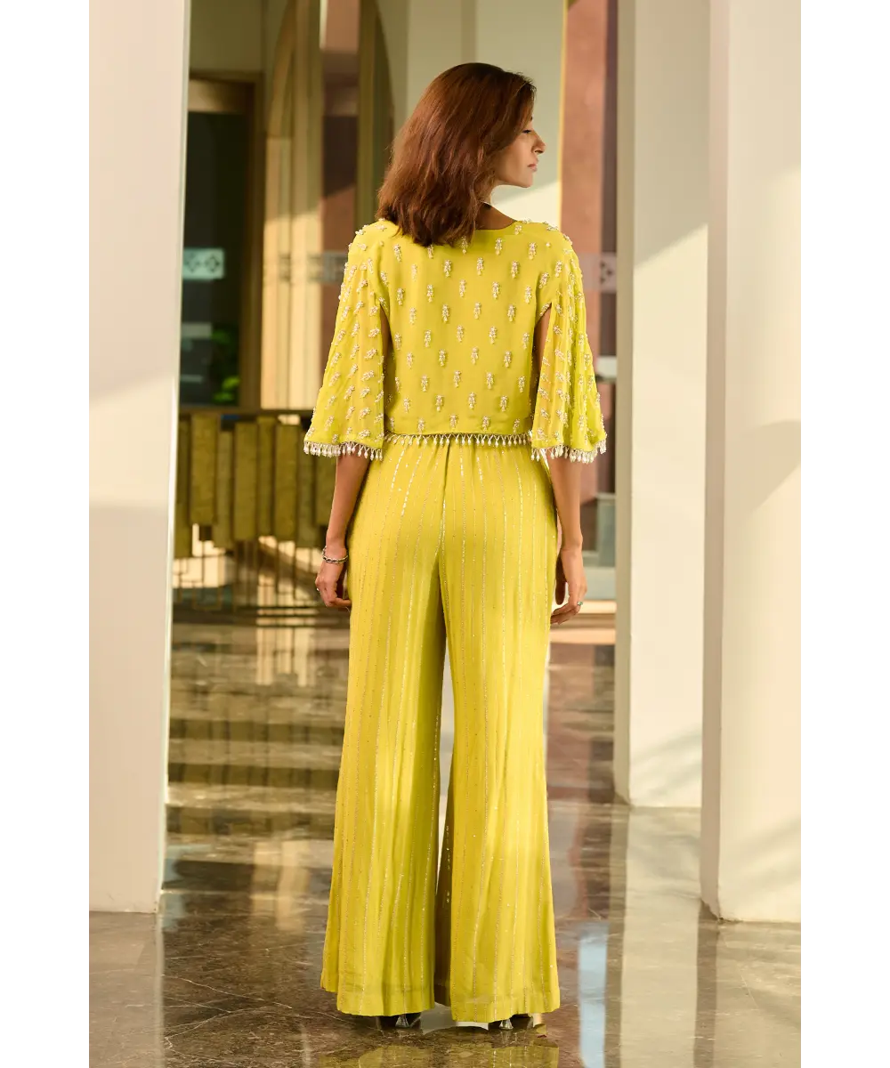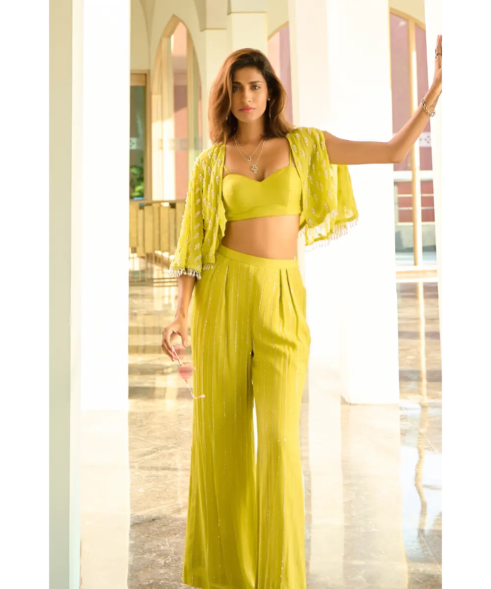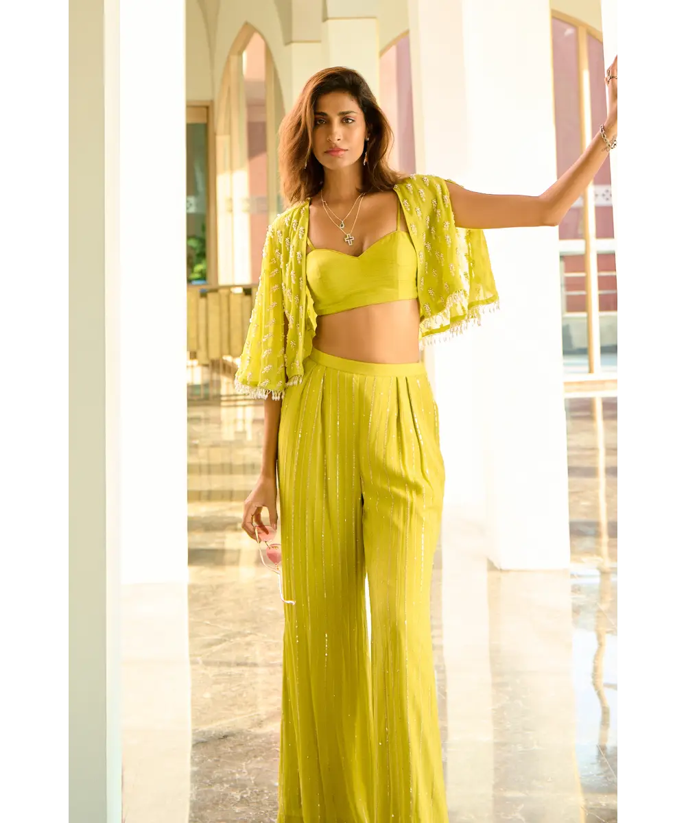 Lime green pant and bustier paired with embellished organza cape