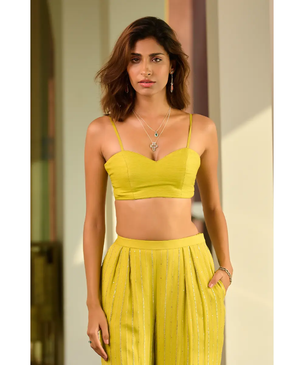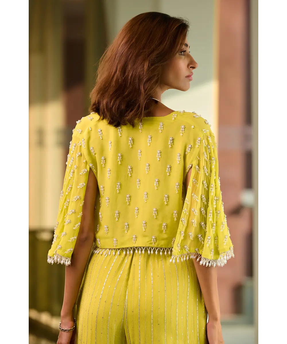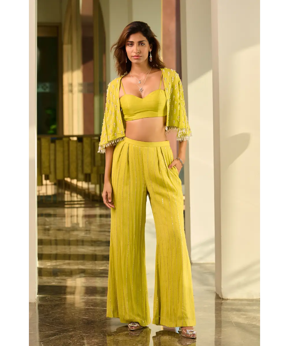 Lime green pant and bustier paired with embellished organza cape