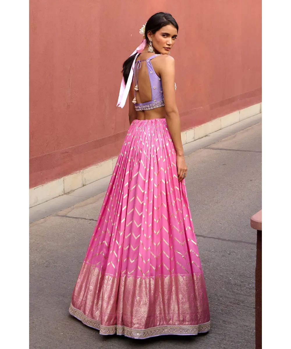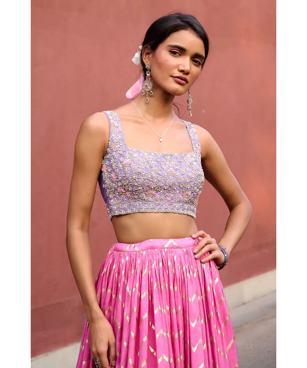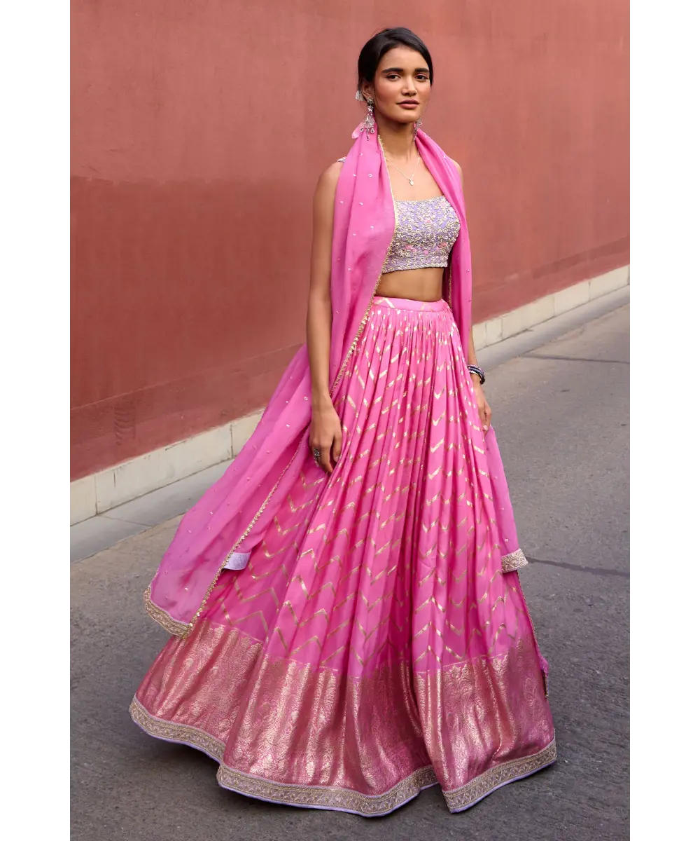 Pink Chevron ruched lehenga paired with lavender delicate zardozi work blouse and organza dupatta