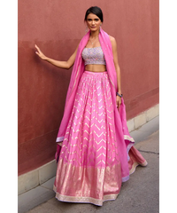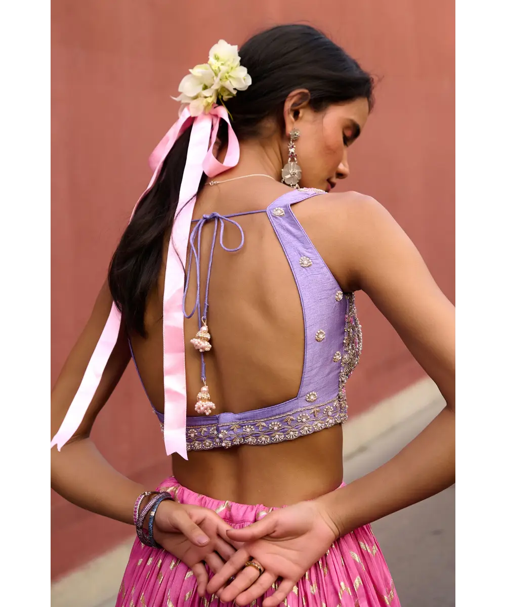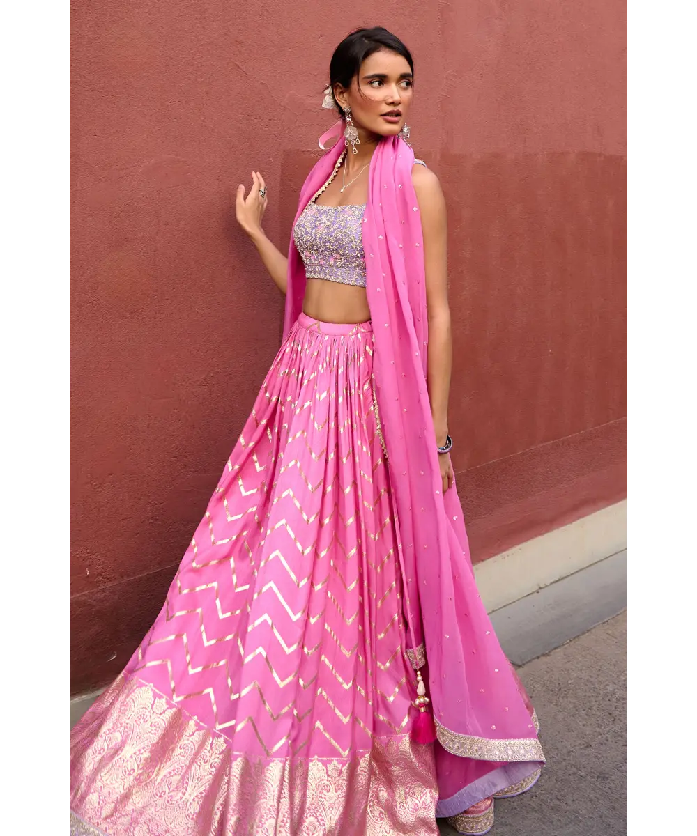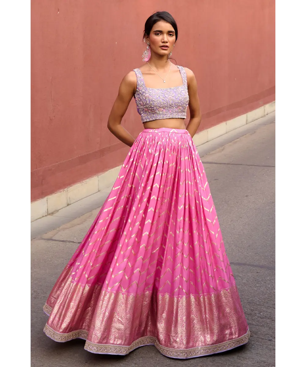 Pink Chevron ruched lehenga paired with lavender delicate zardozi work blouse and organza dupatta