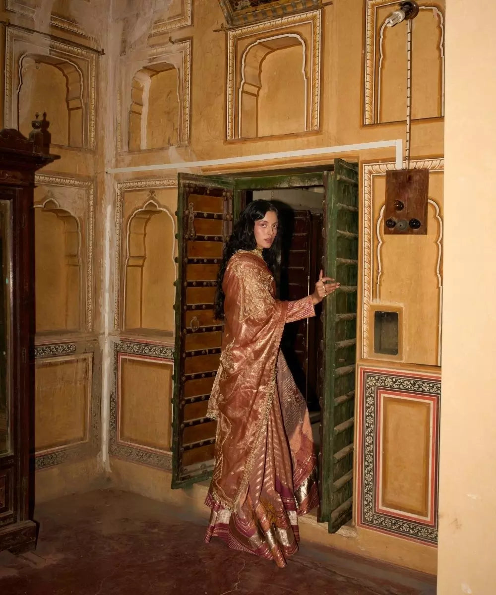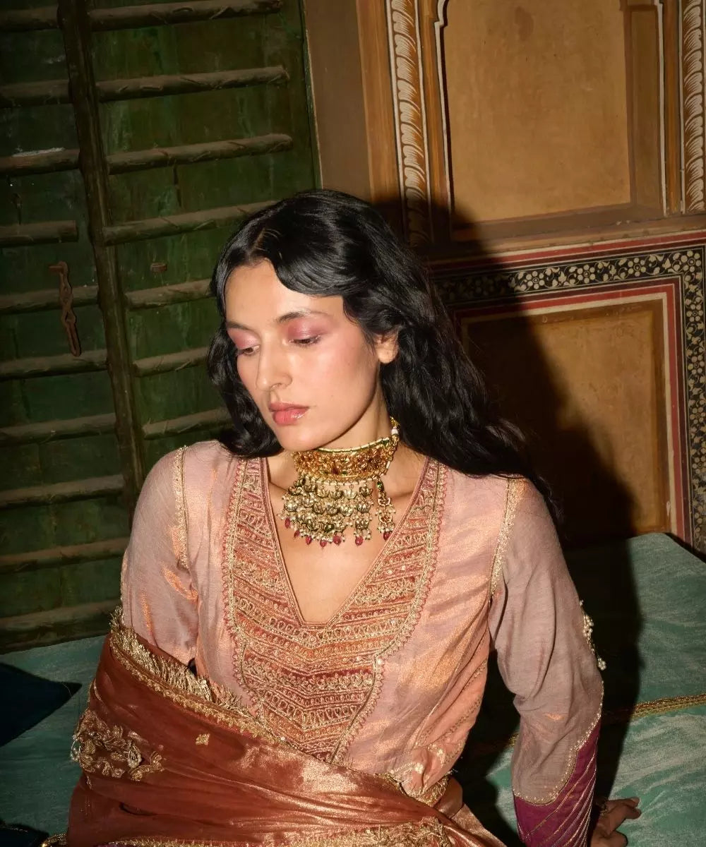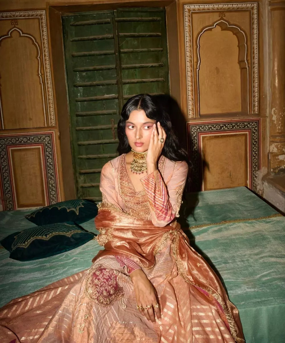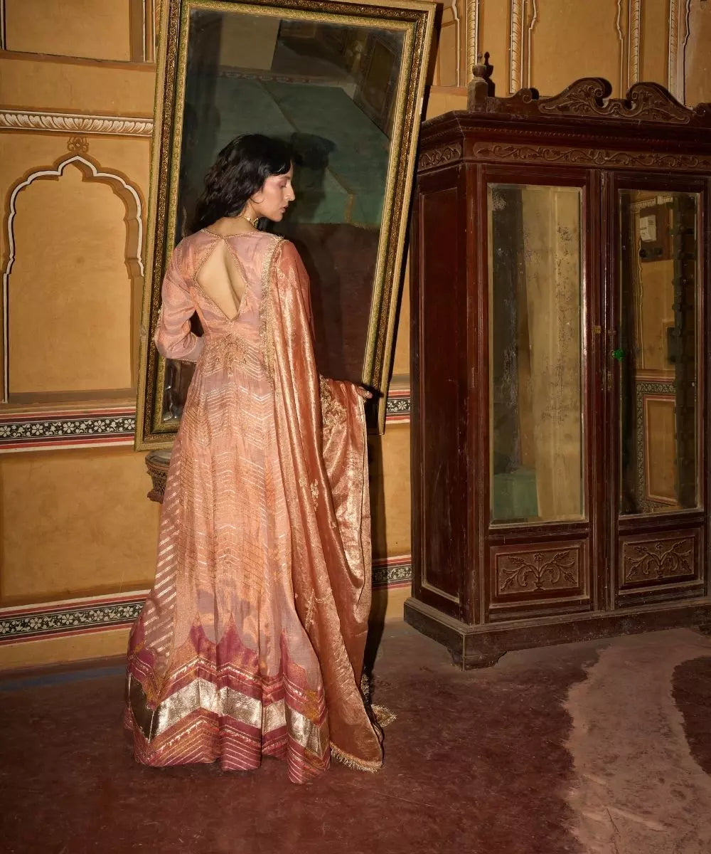 This Kalidar Anarkali set, crafted in peach silk zari tissue and jacquard Banarasi silk, features intricately embroidered elongated motifs with gota texturing, dori, zari, and fine threadwork. Paired with a monochromatic tissue dupatta adorned with floral-inspired embroidery and subtle sequins, its look is elevated by a beautifully textured V-shaped gota patti border that adds a touch of refined elegance. Crepe lining