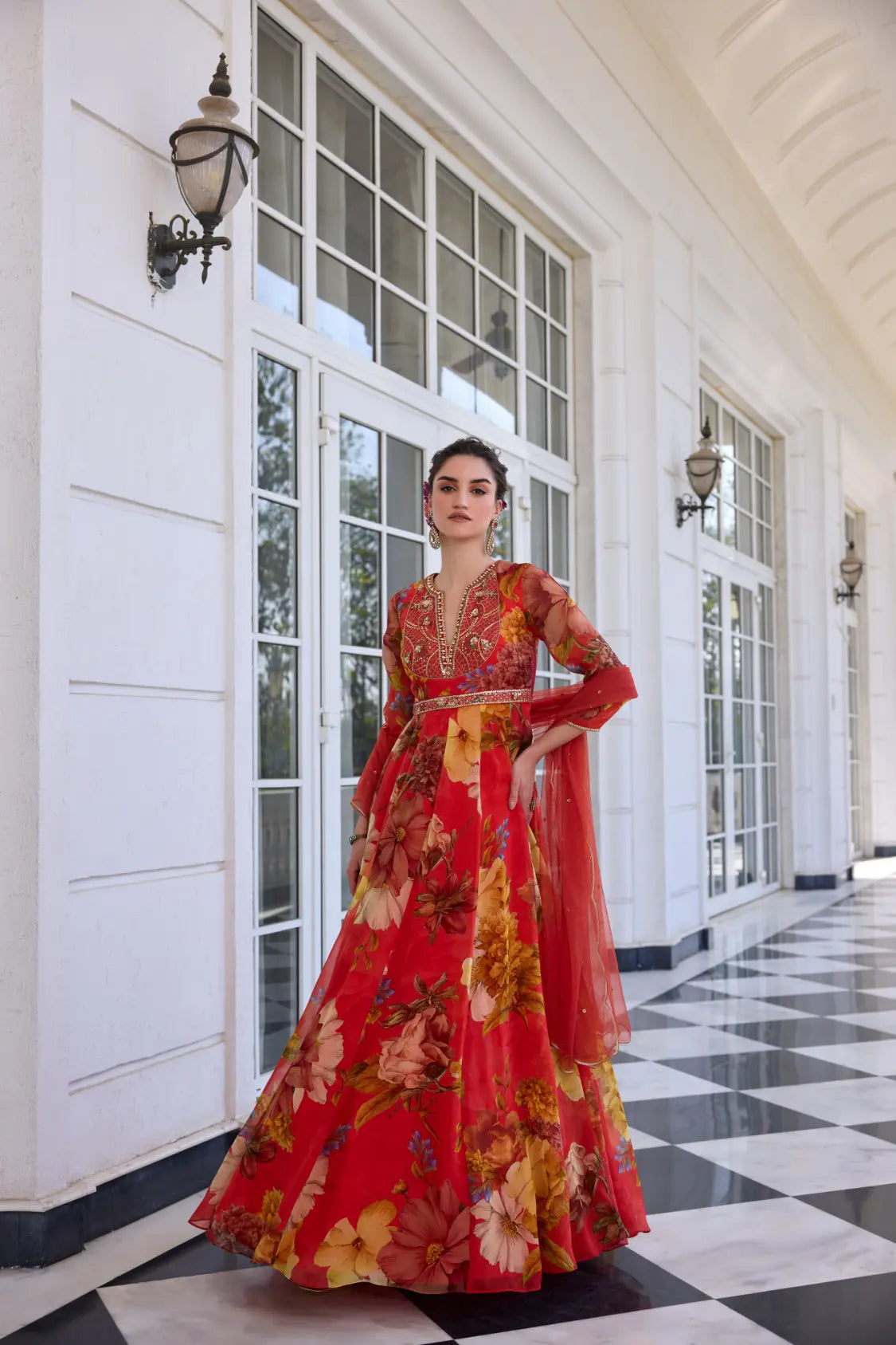Stand out in the elegance of  flowy Anarkali set with delicate floral motifs and intricate hand embroidery on the yoke neckline and sleeves. It is elegantly paired with a sheer organza dupatta, adding a graceful touch to the ensemble.