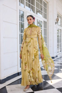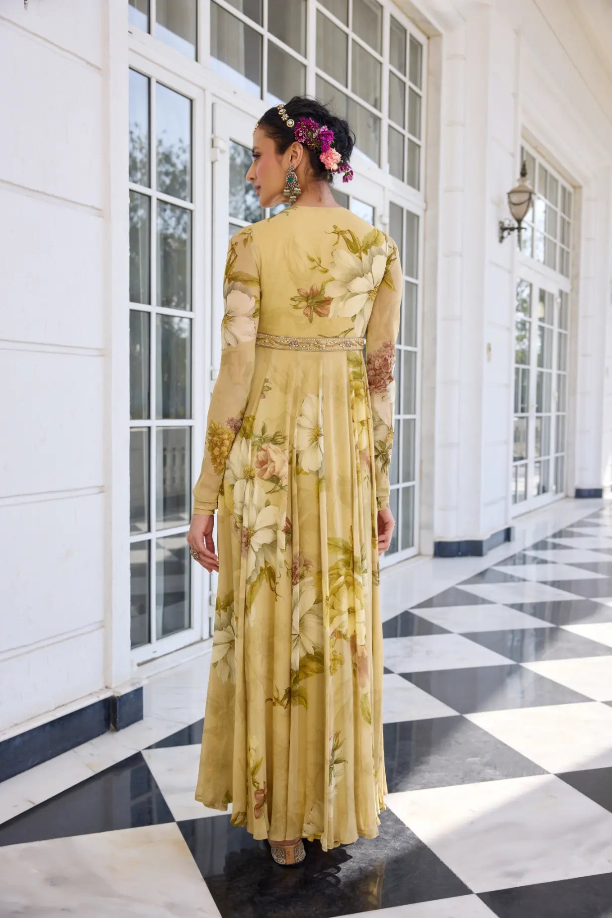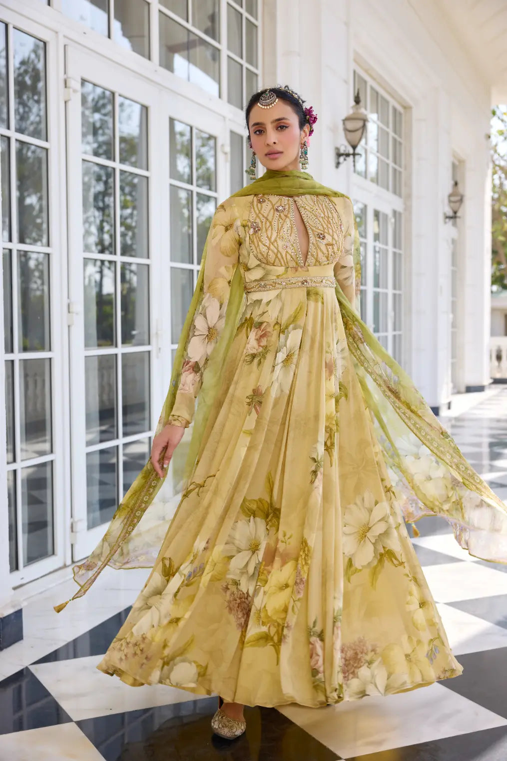 Featuring Tarini a flowy anarkali set in soft floral motifs and an intricately hand embroidered of beads and sequines on the yoke paired with waist band and printed dupatta. Perfect for any Festive or wedding festivities to make a style statement.