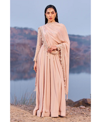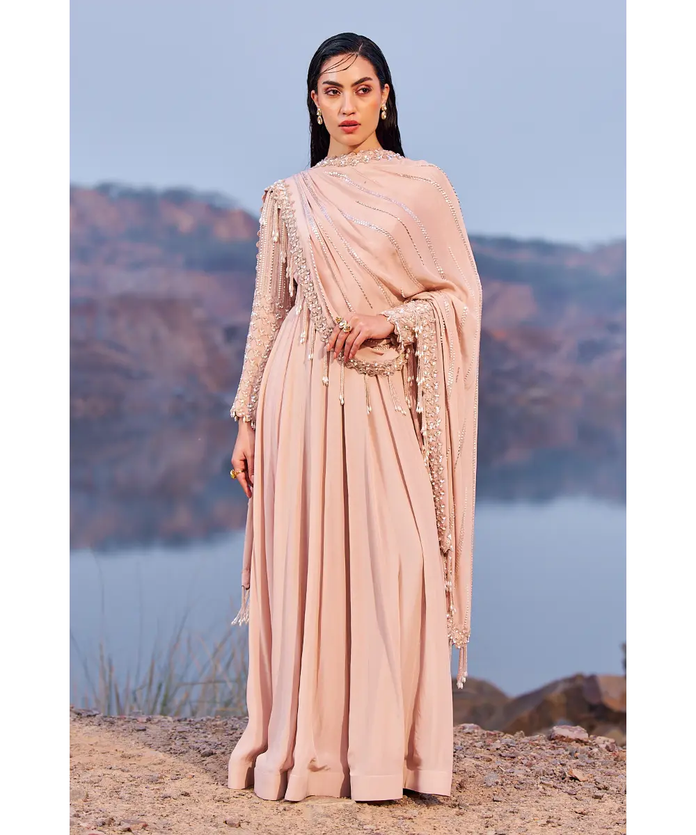 JALSAA E BAHAAR DRAPE DUPATTA ANARAKALI IS IN CREPE FABRIC. ITS IN BEAUTIFUL PASTEL ROSE COLOUR WITH EMBROIDERED FULL SLEEVES AND DUPATTA. ANARKALI IS PADDED AND HAVE SIDE ZIP CLOSURE.(drape dupatta is attached)