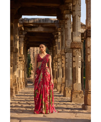 AWIGNA - Fuchsia printed embellished drape saree