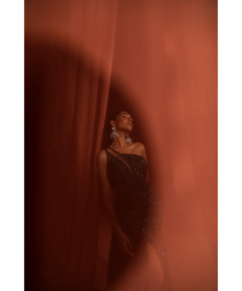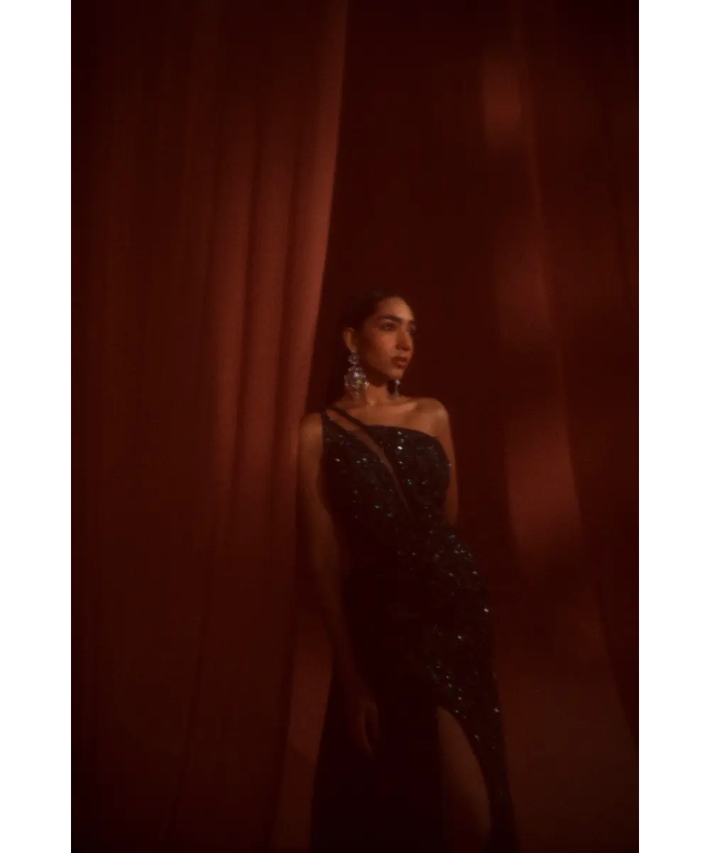 This elegant lean gown features a blend of lines, scattered embroidery with semi-circles and floral motifs, and intricate machine dori work. Adorned with a mix of hand-embroidered sequins, crystals, stones, and more, it offers a luxurious and detailed finish, perfect for any special occasion.