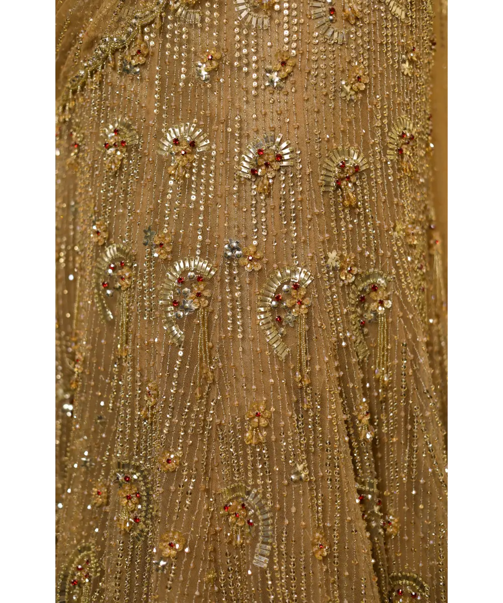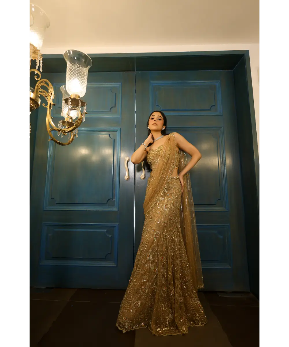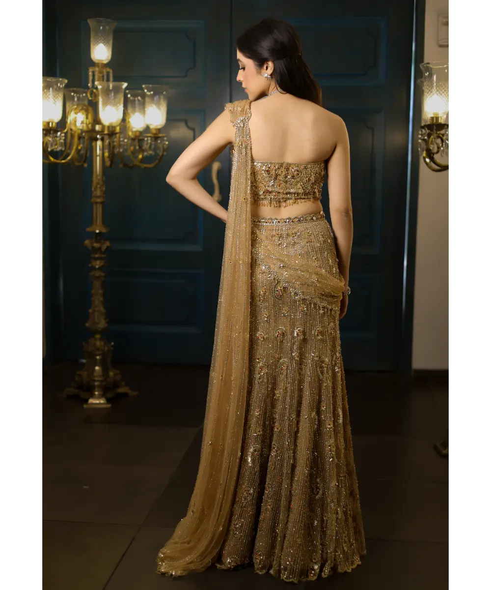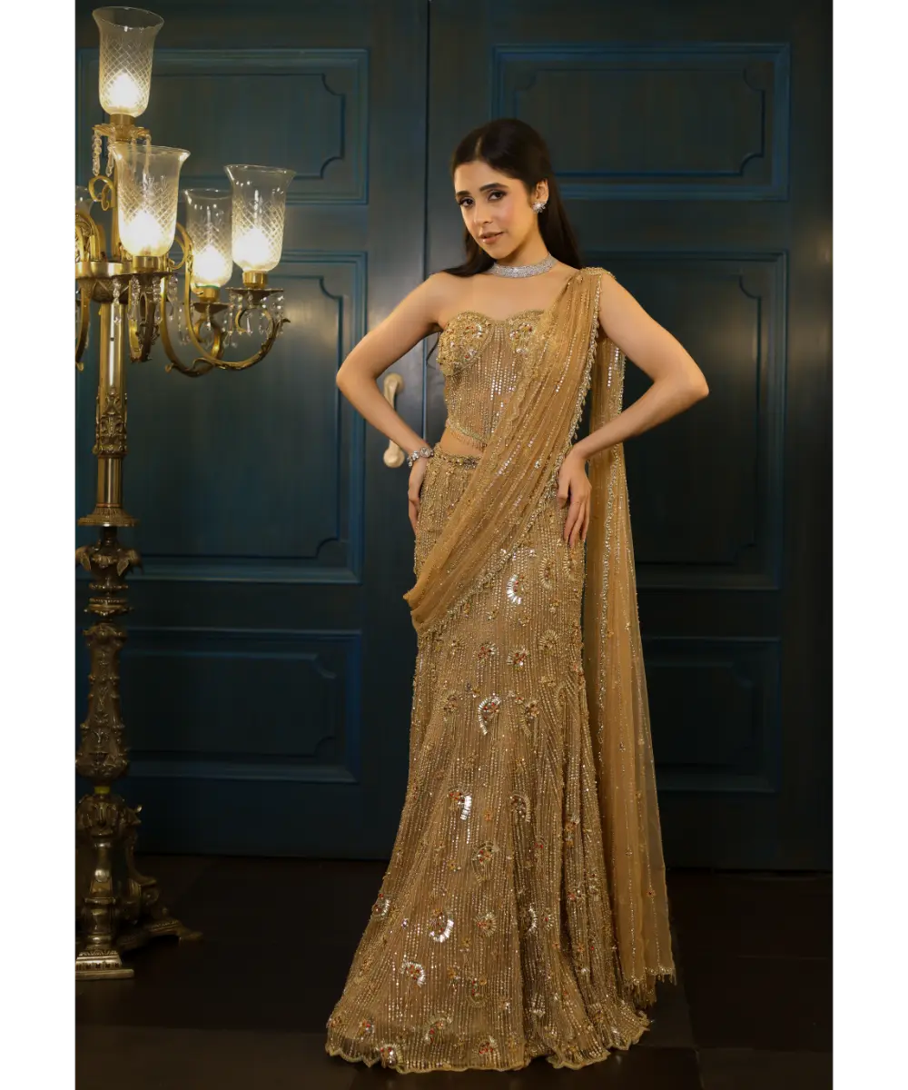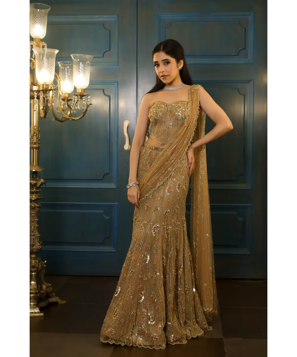 Featuring a gold pre-draped skirt in net base with crystal and motif embroidery. It is paired with a corset and a drape dupatta Accentuate with statement jewellery and heels for a wedding, sangeet or cocktail ceremony.