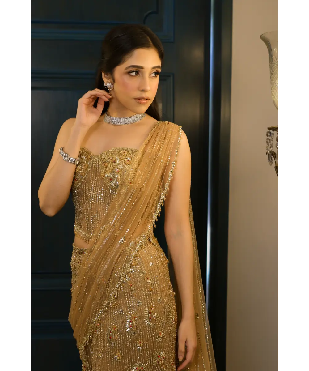 ISA BY DOLLY WAHAL - Gold Net Crystal Embroidered Pre-Draped Skirt Saree Set - XS