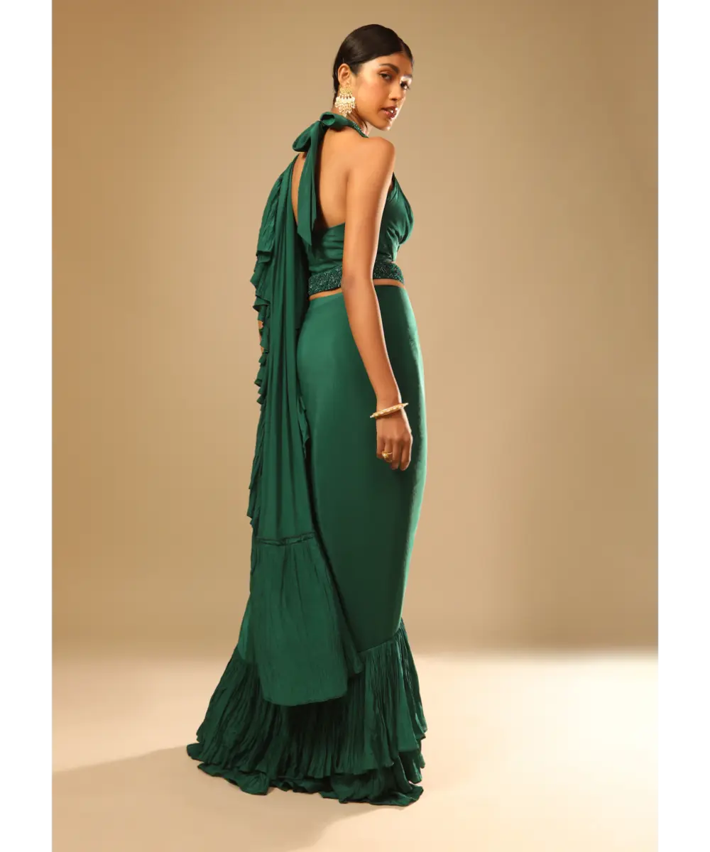 KALKI - Emerald Green Ready Pleated Ruffle Saree With A Halter Neck Blouse And 3D Embroidered Belt - XS
