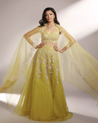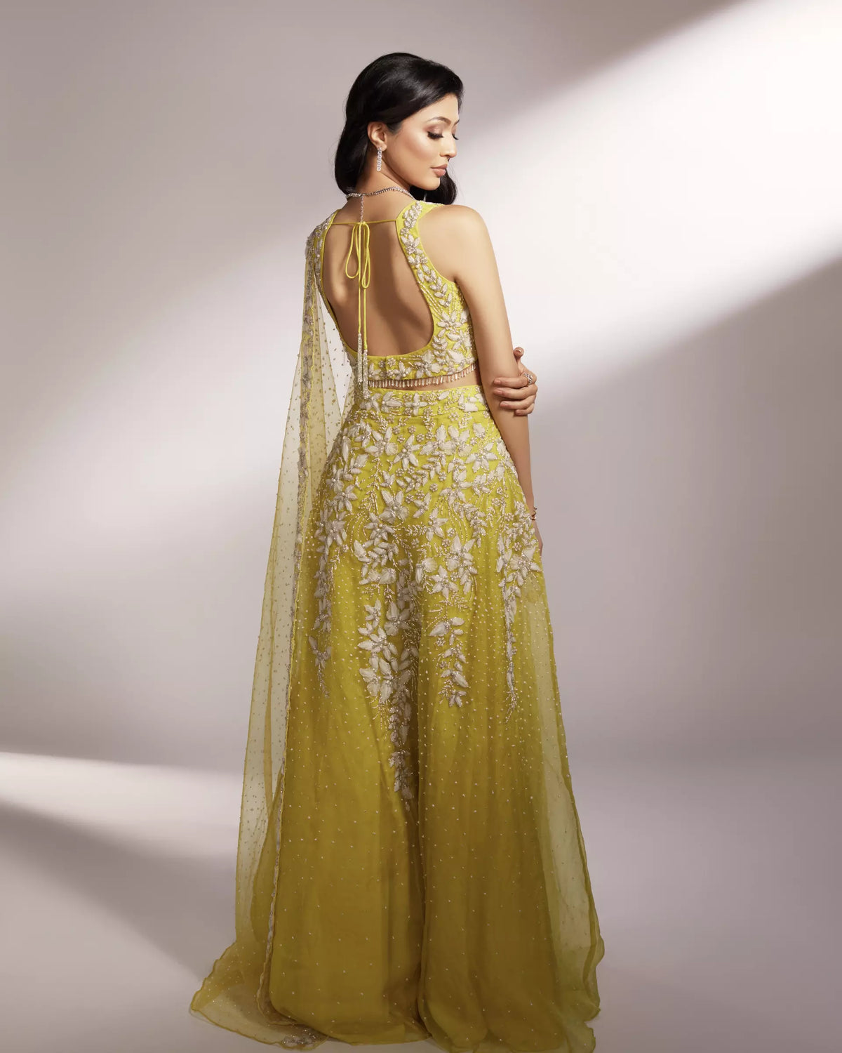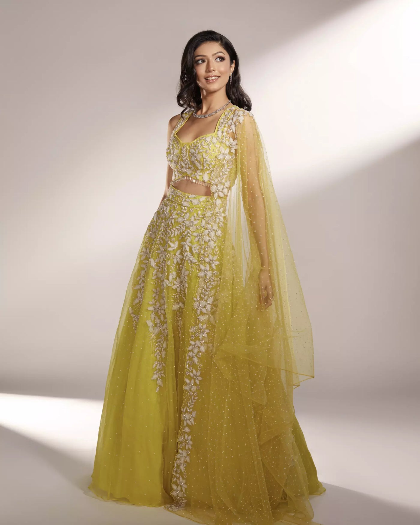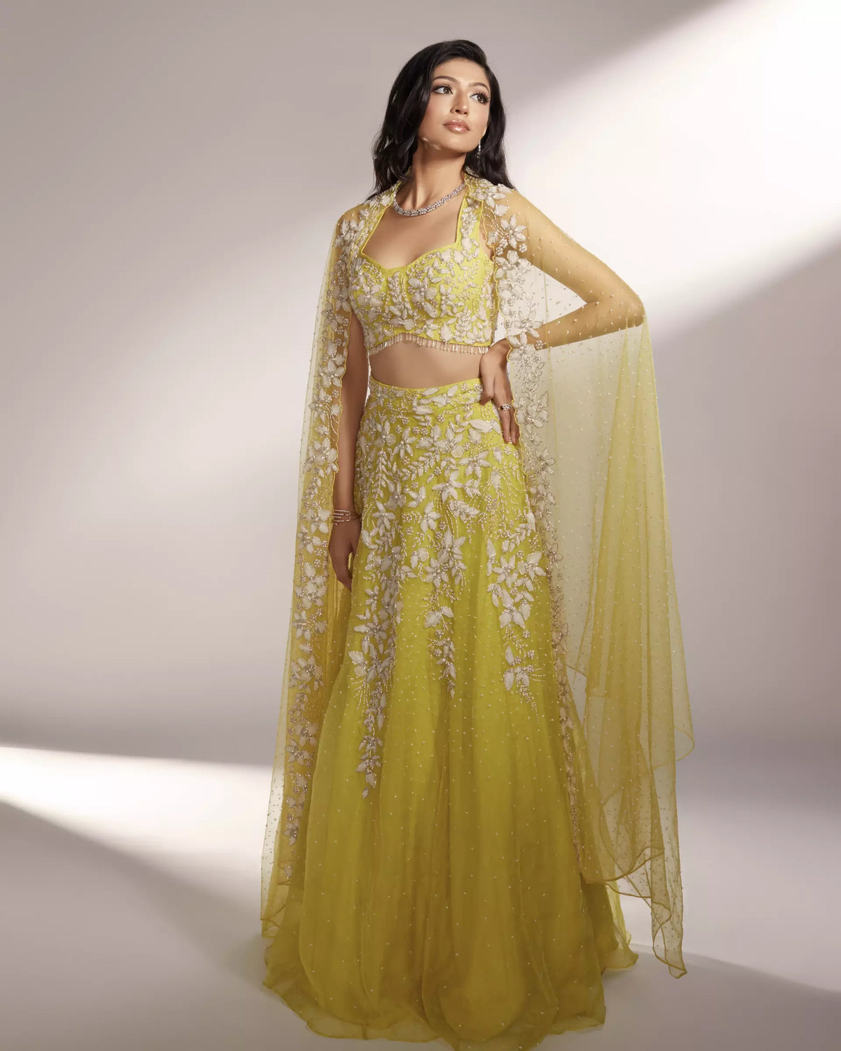FEATURING IRIS - Iris is our lime yellow lehenga, paired with a embroidered blouse and one side embroidered dupatta, embellished with organza floral details accompanied with silver glass beads and pearls.
