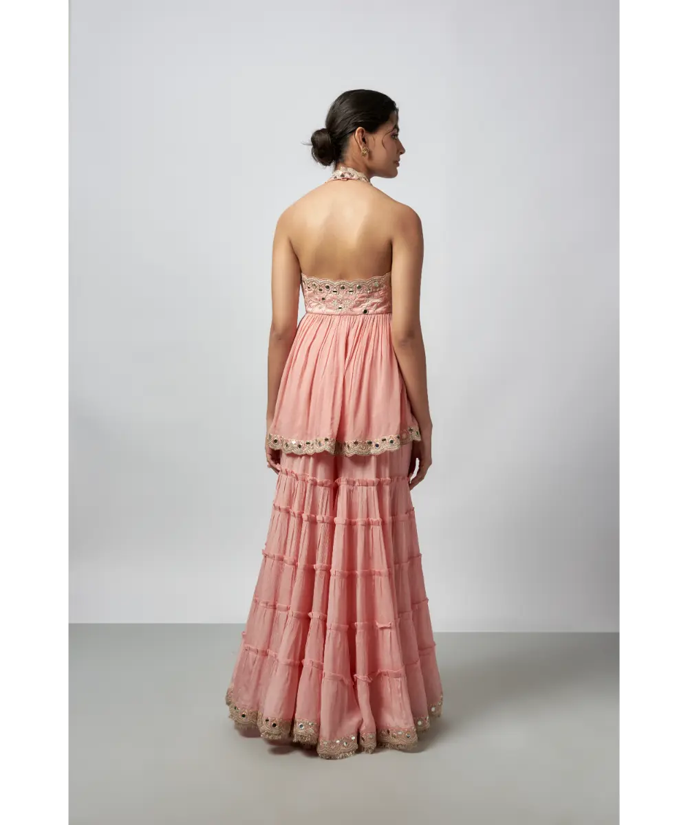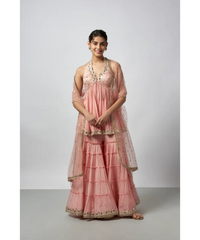 This delightful outfit features a halter neck kurta with intricate embroidery and mirror work, creating a soft yet striking appeal. Paired with tiered sharara with embroidered details and mirror embellishments at the hem. Completing the look is a net dupatta, delicately dotted with sequins and bordered with shimmering accents.