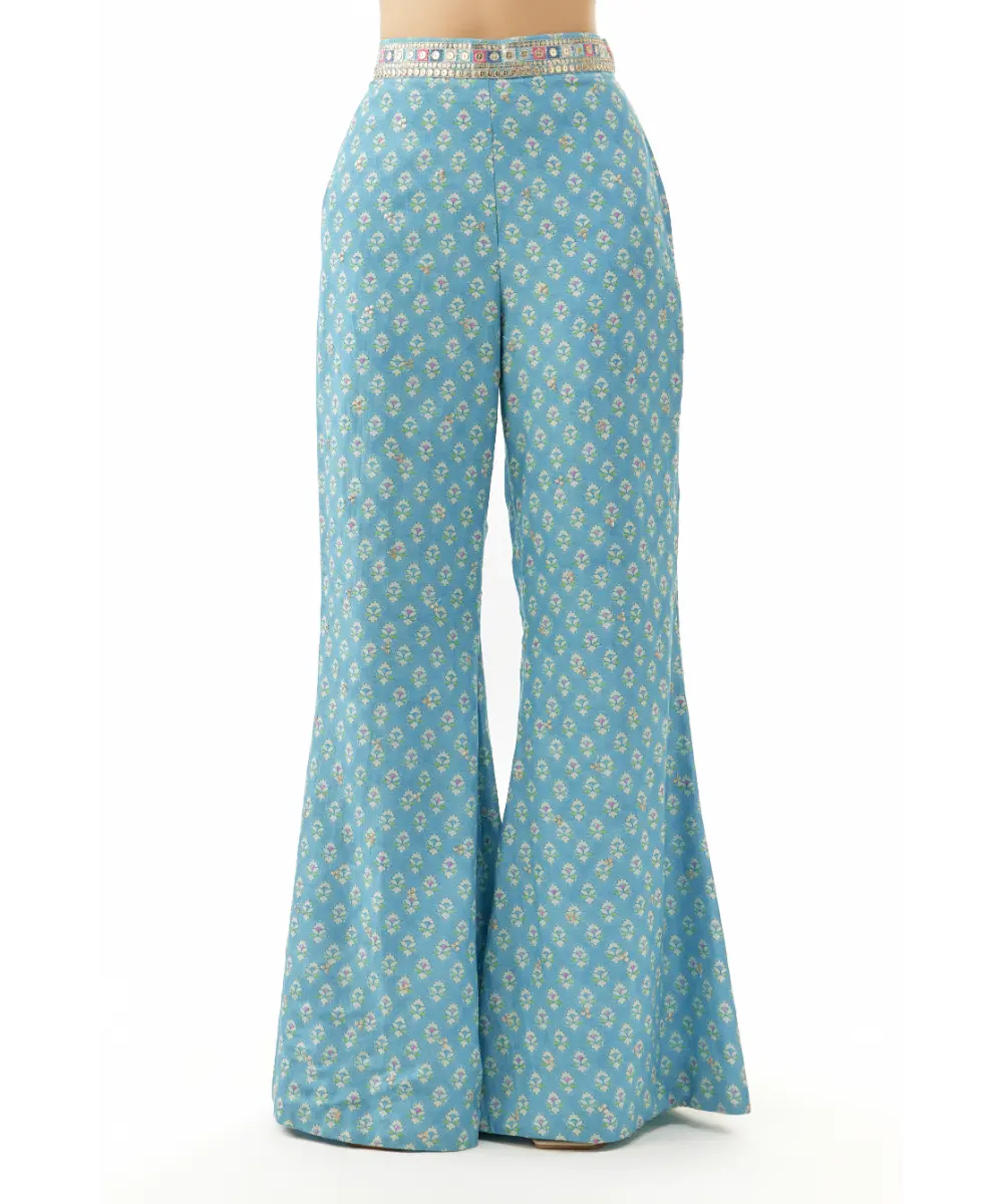 paired with high-waisted printed pants in a breezy silhouette, this look is elevated with a flowy, matching cape-style jacket that drapes gracefully over the shoulders. The cape is highlighted with delicate embroidery and a scalloped border, adding the perfect touch of elegance and flair.