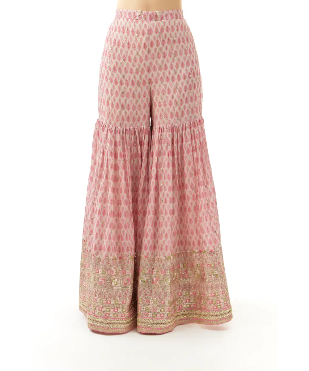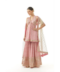 Featuring a halter-neck short kurti adorned with embroidery. The lightweight fabric flows gracefully, complemented by a flared sharara pant in matching hues and traditional motifs that bring out the richness of ethnic wear. A sheer, soft net dupatta with an embellished border enhances the look.