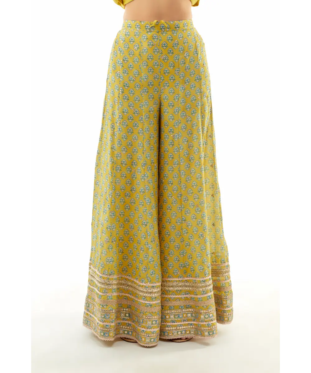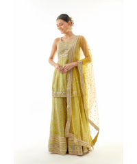 The ensemble features a beautifully crafted sleeveless kurti adorned with intricate embroidery lending a regal touch to the outfit. The matching sharara pants are gracefully flared and detailed with complementary embroidery at the hem, creating a balanced and eye-catching silhouette. Paired with a delicate dupatta embellished with motifs and a detailed border.
