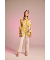 Featuring vintage inspired floral Tunic set effortlessly blends elegance with comfort, making it the perfect addition to your wardrobe. In silk button-down shirt collar in Asymmetrical silhouette, beautiful floral motifs and cuff detailing this set is designed with a modern yet timeless appeal. The soft Green hue adds a refreshing, feminine touch, while the silhouette ensures a seamless and chic look. Making it ideal for both casual outings and special occasions.