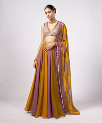 COLOR - BLOUSE-MUD MAUVE, LEHENGA PANTS-GREEN-MUSTARD-MUD MAUVE, DUPATTA-GREEN-MUD MAUVE-MUSTARD