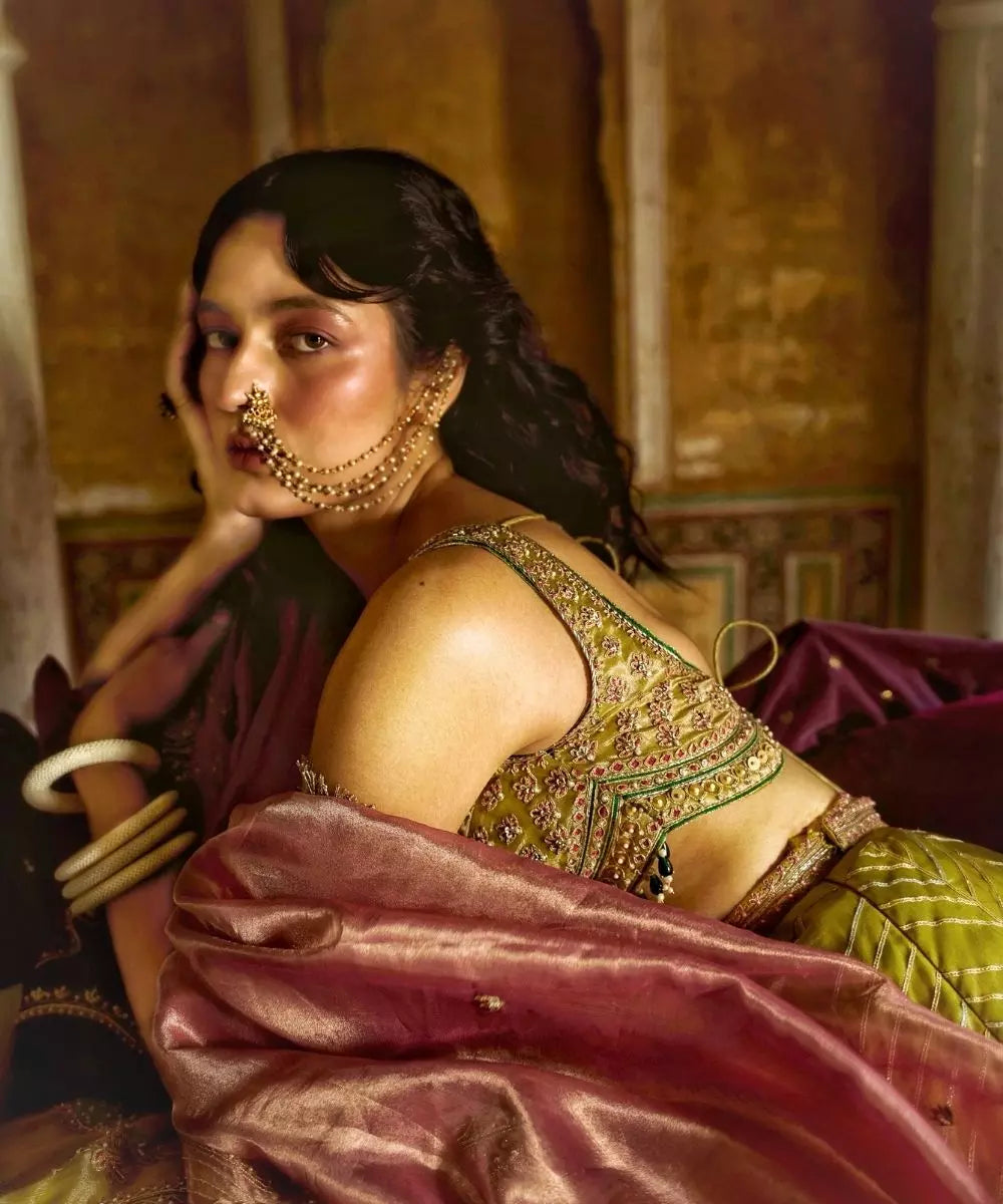 This Lemon green kalidar lehenga in pure tissue radiates charm with delicate half-moon and paisley motifs, beautifully filled with blooming floral embroidery. Intricate detailing and a rich gota patti border enhance its regal allure. Paired with an embroidered blouse with drop latkans and a rose pink tissue dupatta adorned with shimmering gota, subtle sequins, and ornate lace-edged borders, the ensemble blends tradition with graceful sophistication. Crepe lining with attached cane cane layer for the flair.