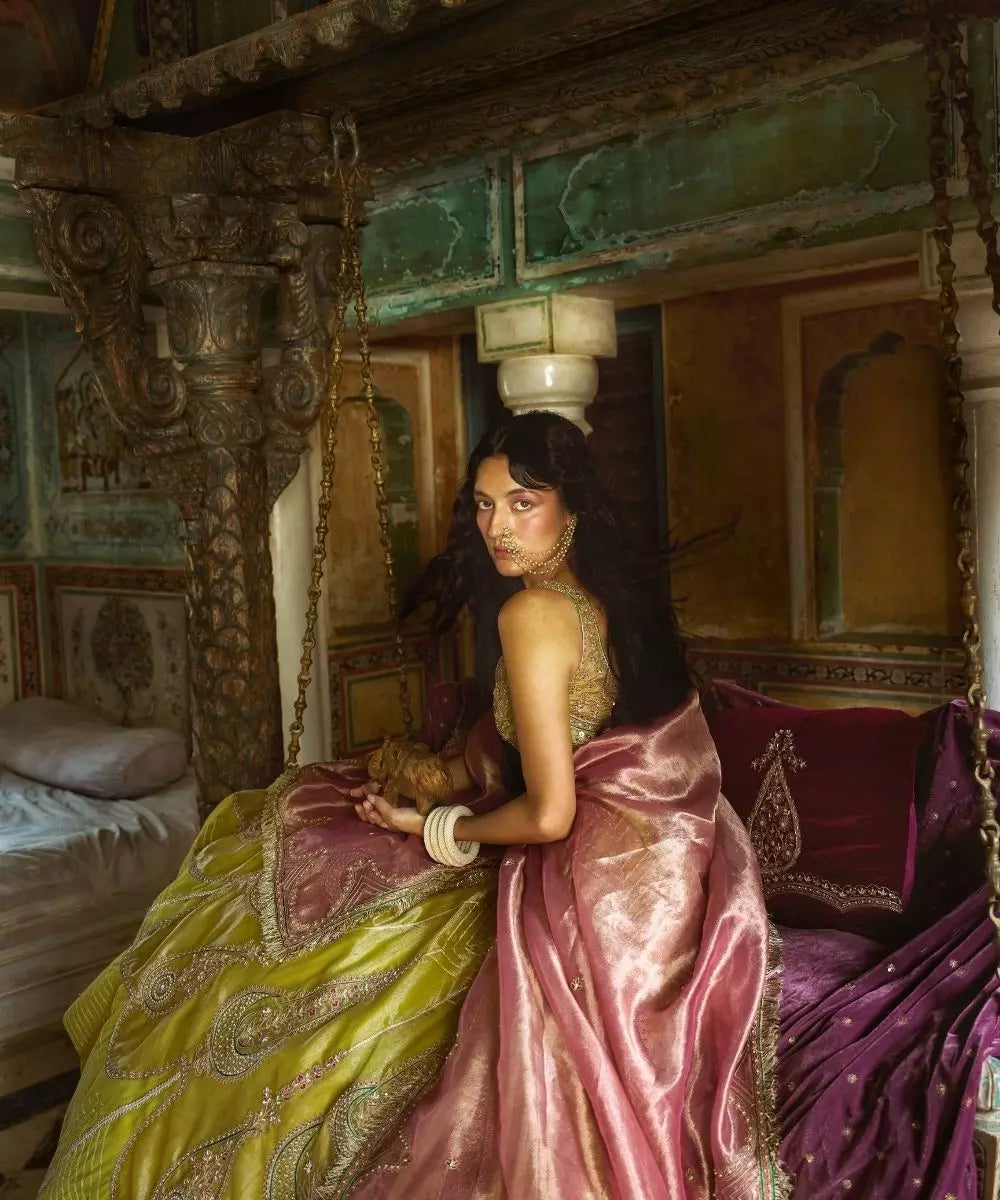 ADITI GUPTA - Lemon Green Silk Zari tissue with Rose Pink tissue dupatta Lehenga Set