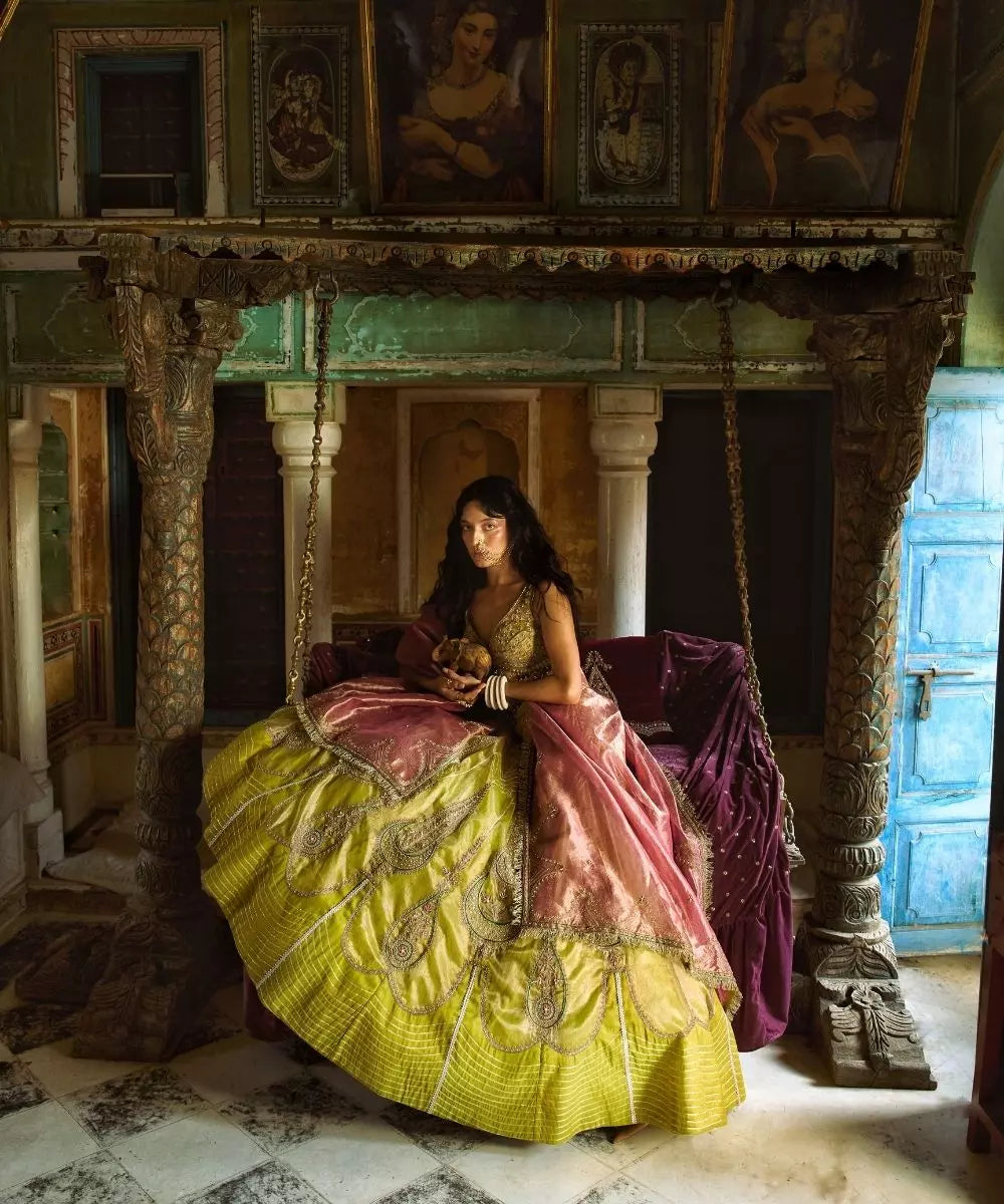 ADITI GUPTA - Lemon Green Silk Zari tissue with Rose Pink tissue dupatta Lehenga Set - XS