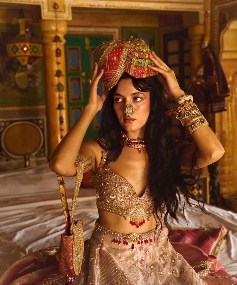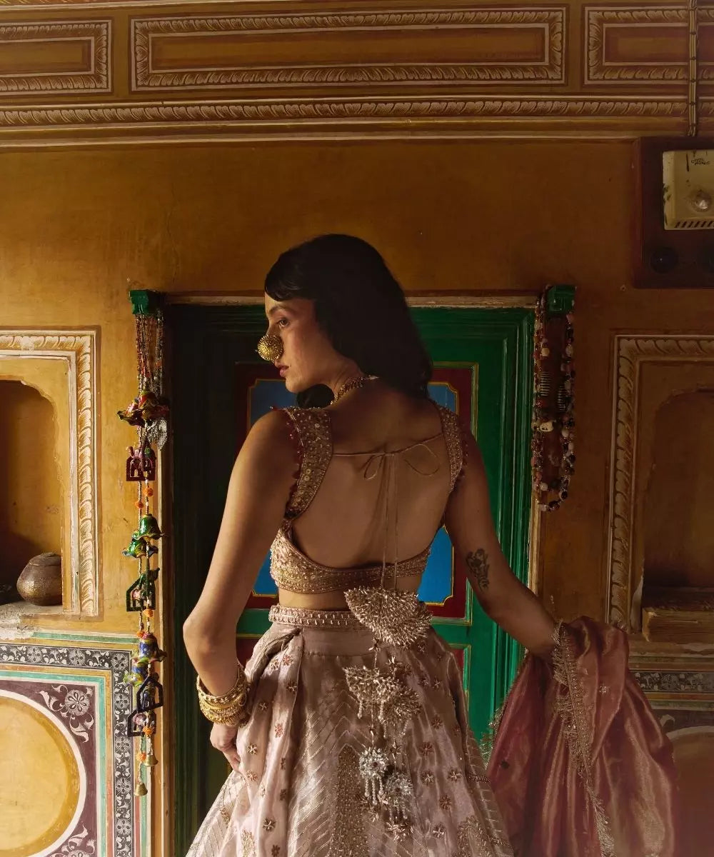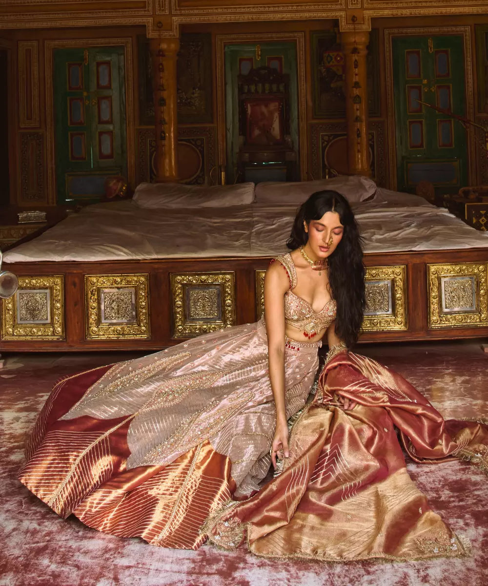 ADITI GUPTA - Rose Gold pure zari tissue with rose pink tissue dupatta Lehenga Set