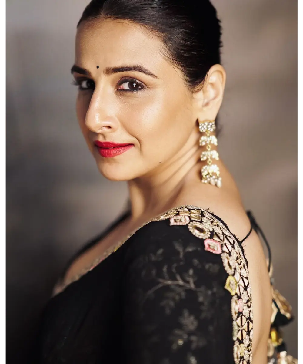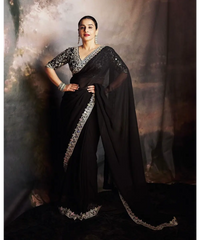 This timeless, elegant black saree is adorned with intricate silver embroidery along its borders. The saree is paired with a half-sleeve blouse featuring heavy embroidery and sequin detailing, adding a touch of sparkle and richness to the ensemble.