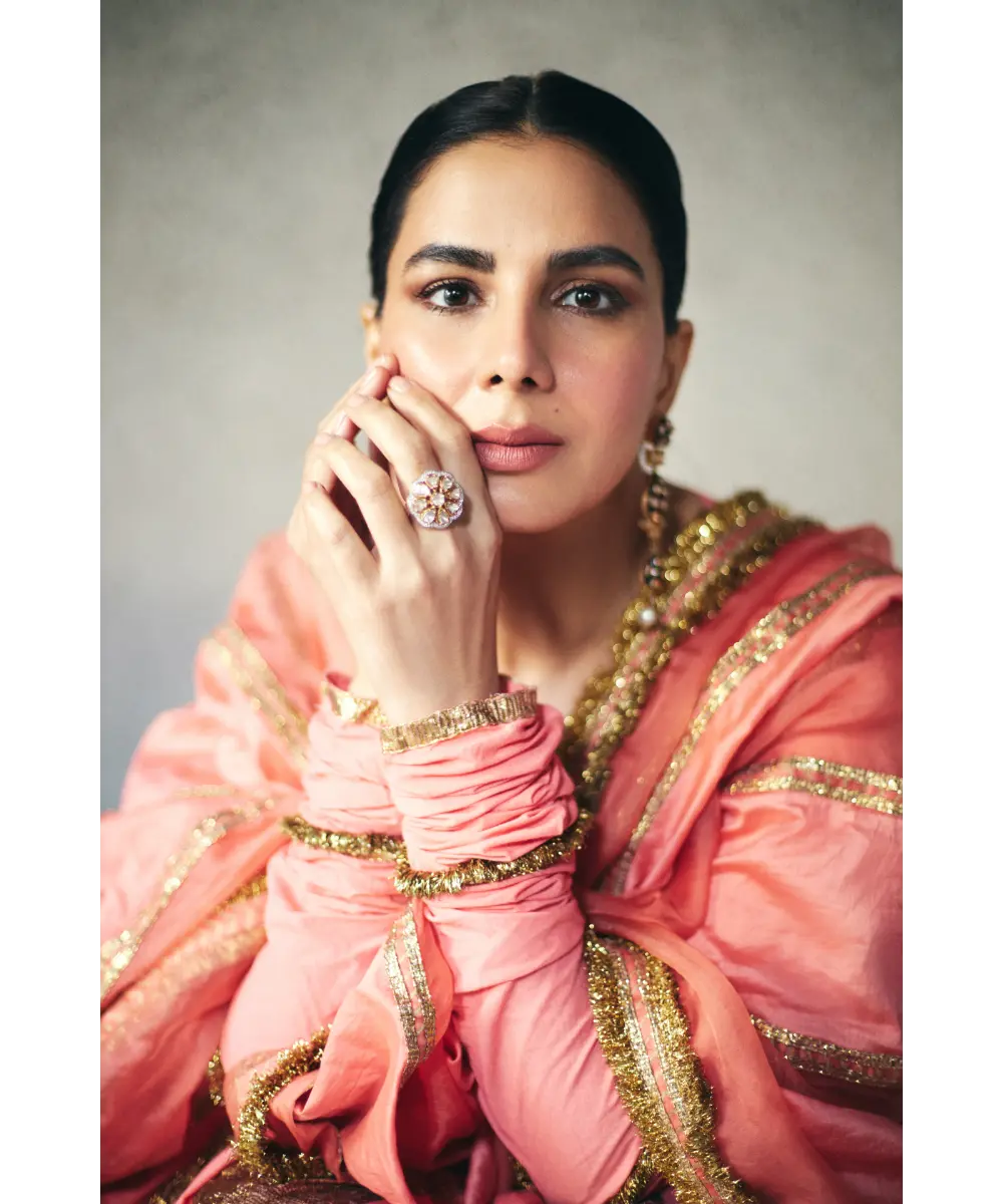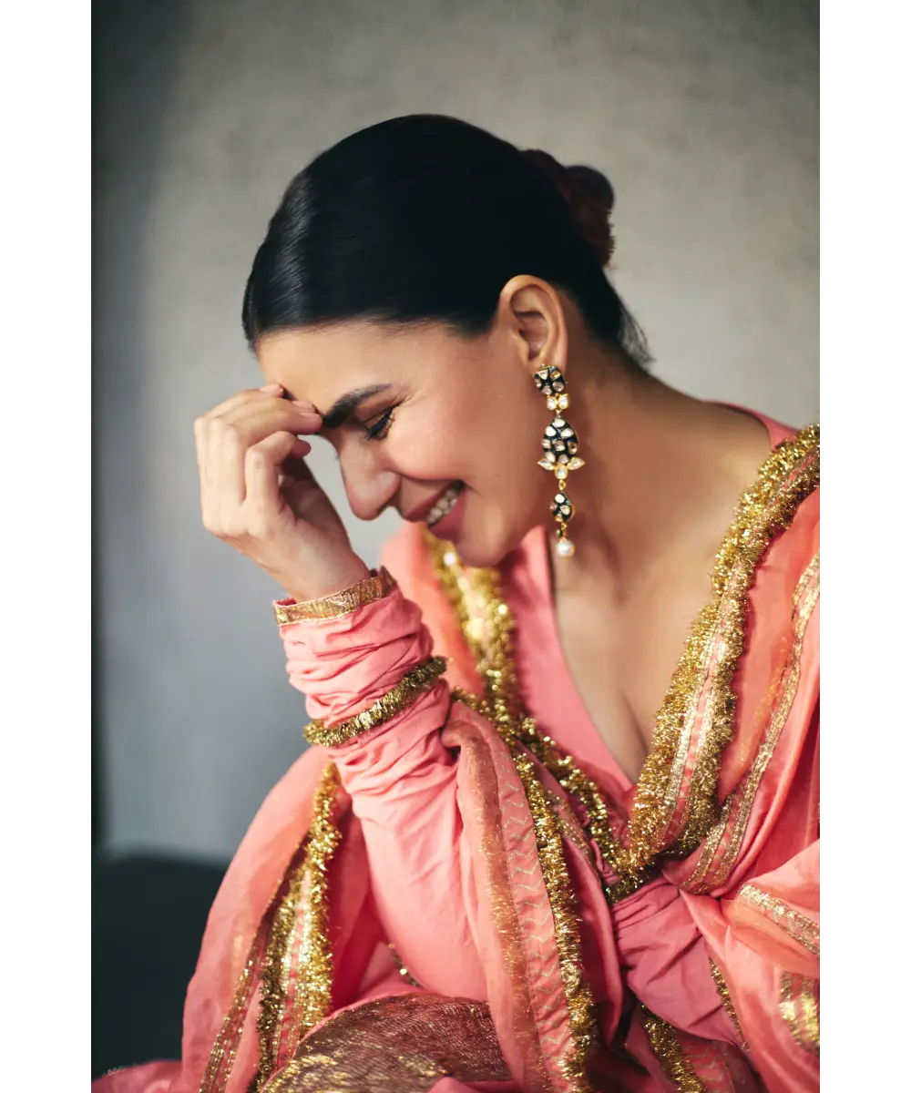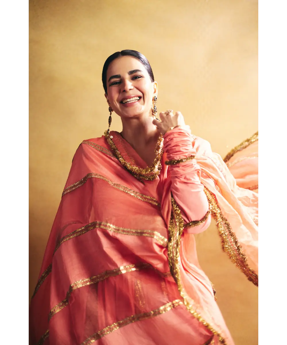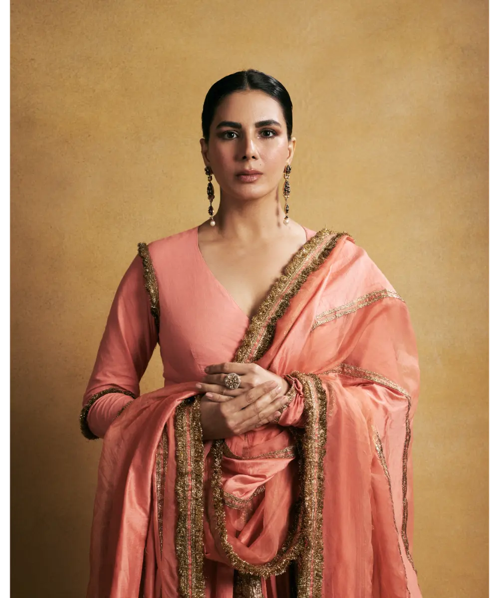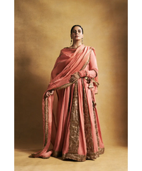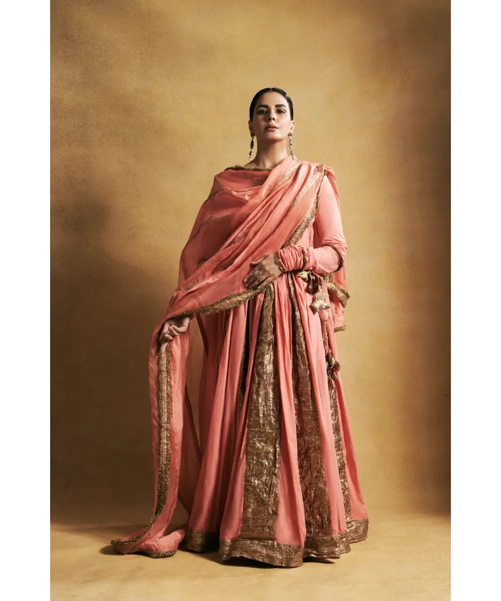 Peach cotton mul angrakha with metallic lampi godet, the tieups have intricate hand made animals for tassels. The dupatta is an alternate panelled organza, chanderi dupatta with traditional kiran