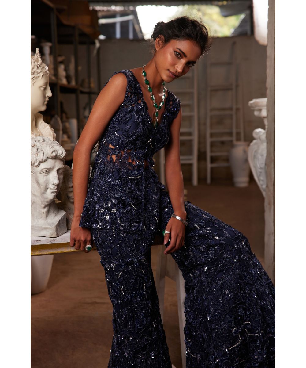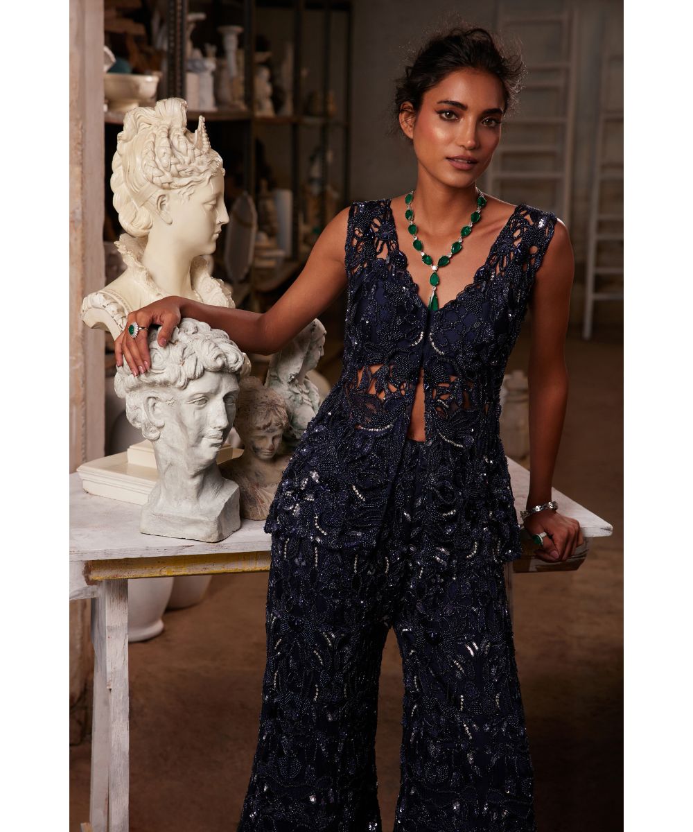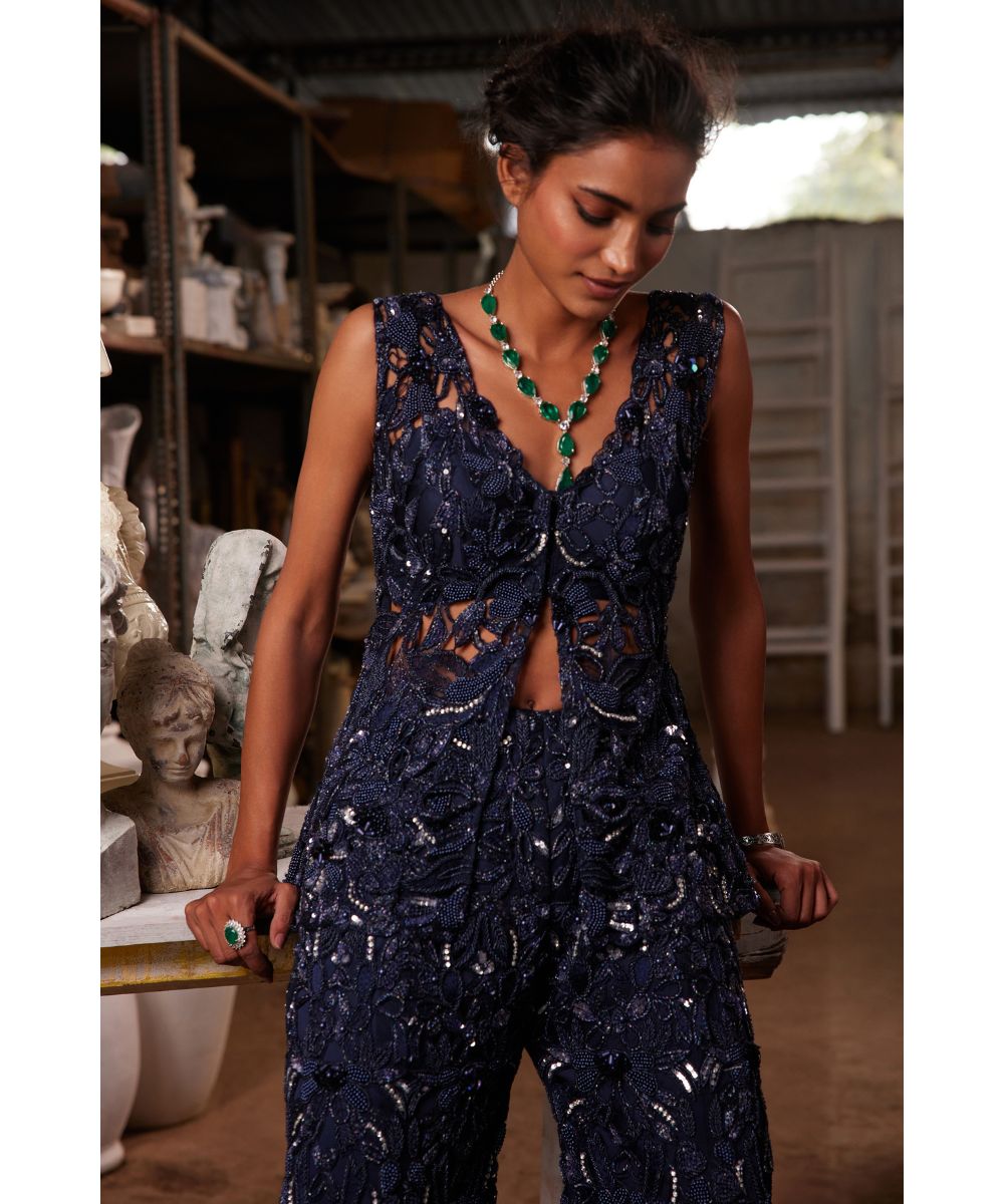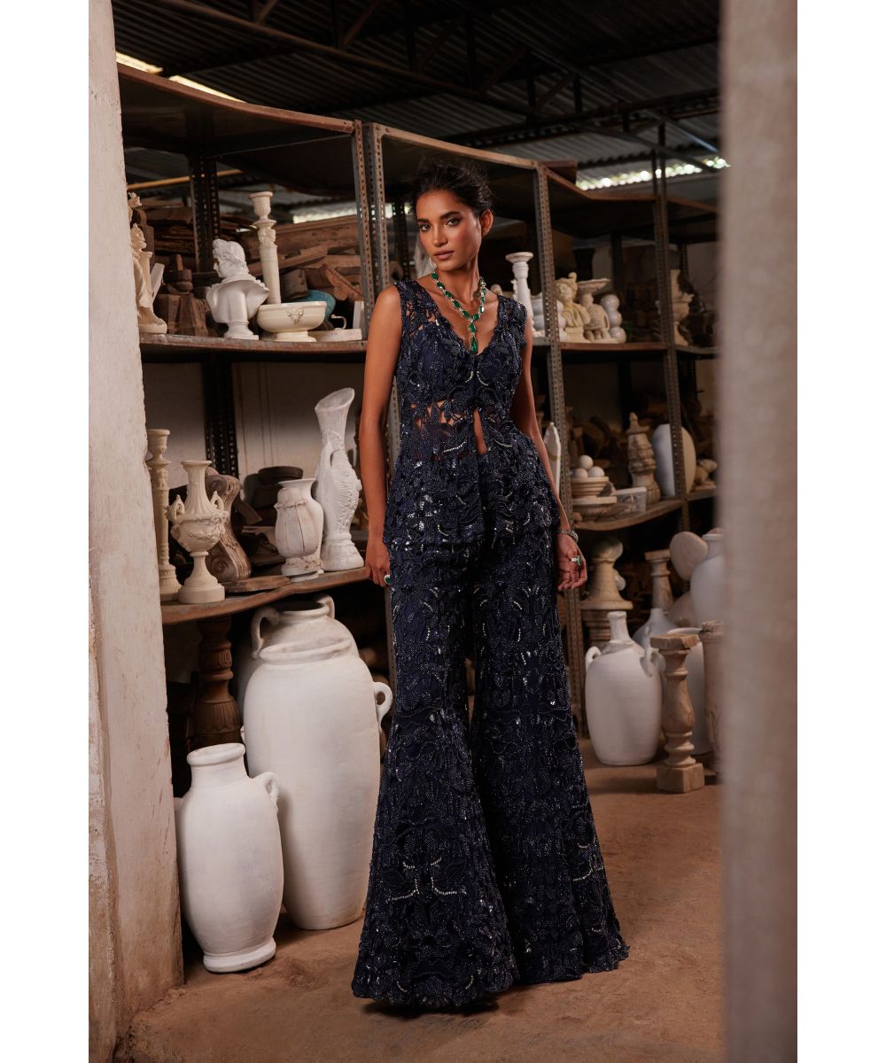 This beautiful sheer jacket top sharara set features delicate cutwork embroidery, adorned with sequins and cut dana beads. Intricate patterns fold in mesmerizing tapestry, creating a shimmering symphony of texture and elegance.
