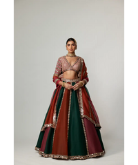 A vibrant multicolor organza Lehenga in jade green, rust and cranberry tones, adorned with golden gota embroidery, paired with a v neck blouse.