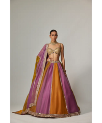 A vibrant multicolor Lehenga in mustard, mauve, and green tones, adorned with golden gota embroidery, paired with a sweetheart blouse and dupatta.