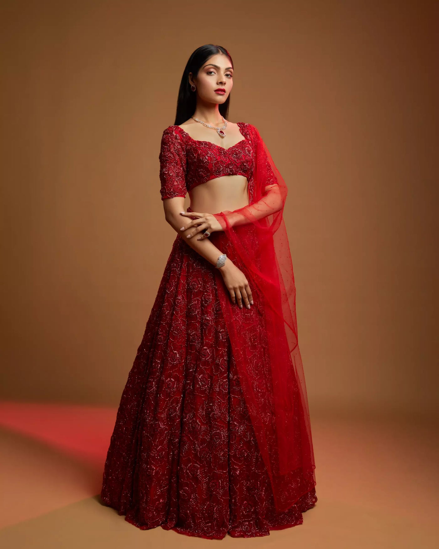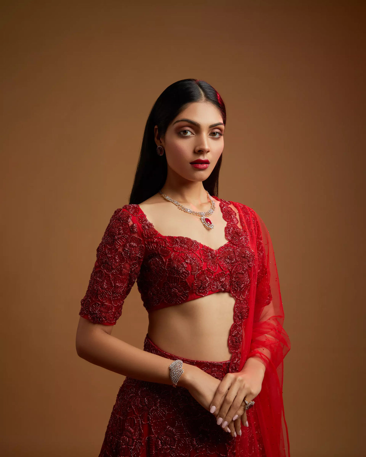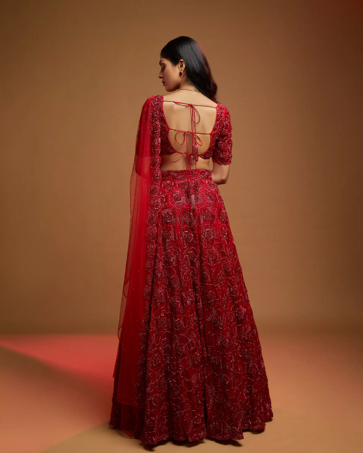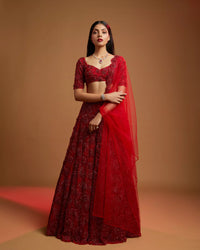 FEATURING KRESTA - Kresta, is our red embroidered lehenga set, embellished with glass beads & resham threads in floral motifs that give it that contemporary touch. A complete embellished blouse and lehenga with a one side bordered dupatta.