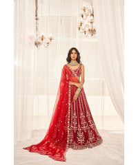 Featuring a Gracious Cherry Red Lehenga in Dupion Silk base with  Zardosi and Aari Embroidery. It includes an hand embroidered zardozi blouse with an embroidered organza cutwork dupatta.