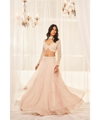 Featuring a Dusty Beige Lehenga in organza base with sprinklers of pearl embroidery. It is paired with an intricate geometric embroidered blouse along with a chocker pearl tulle dupatta with tassles.