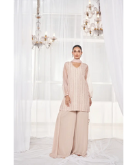 Featuring a Dusty Beige kurta in silk base with geometric zardosi and sequin embroidery. It is paired with a matching flared pants in georgette base along with an embroidered tulle dupatta with tassles.
