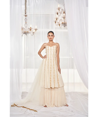 Featuring a Ivory kalidar in silk base having lotus motifs in zardosi, cutdana and pearl embroidery. It is paired with a matching sharara in georgette base and a pearl tulle dupatta with tassles.