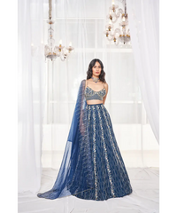 Featuring a glamorous Teal Blue Lehenga in Silk base with cutdana sequins and pearl embroidery. It is paired with strappy intricate embroidered blouse along with an embroidered organza dupatta.