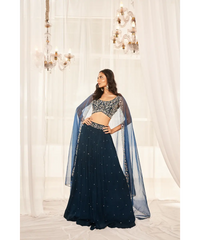 Featuring a Teal Blue Lehenga in wrinkle shiffon Base with sprinklers of  sequins embroidery. It is paired with  silk embroidered cutwork blouse along with an organza cutwork dupatta.