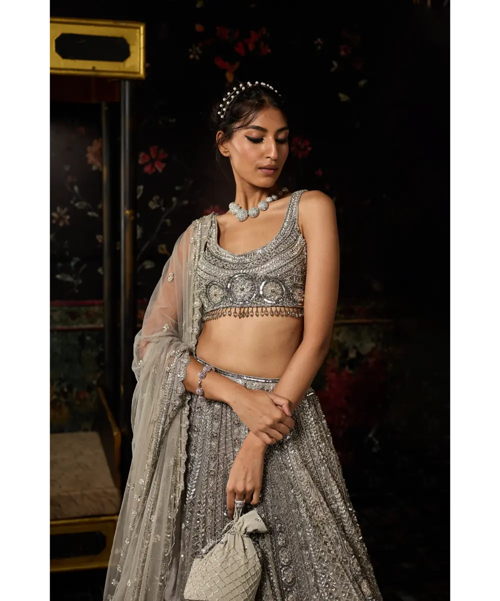GREY GUNMENTAL ARC CIRCLE EMBELLISHED  BLOUSE WITH EMBELLISHED LEHENGA AND EMBELLISHED SCALLOP CUTWORK DETAILED   DUPATTA WITH MATCHING POTLI BAG