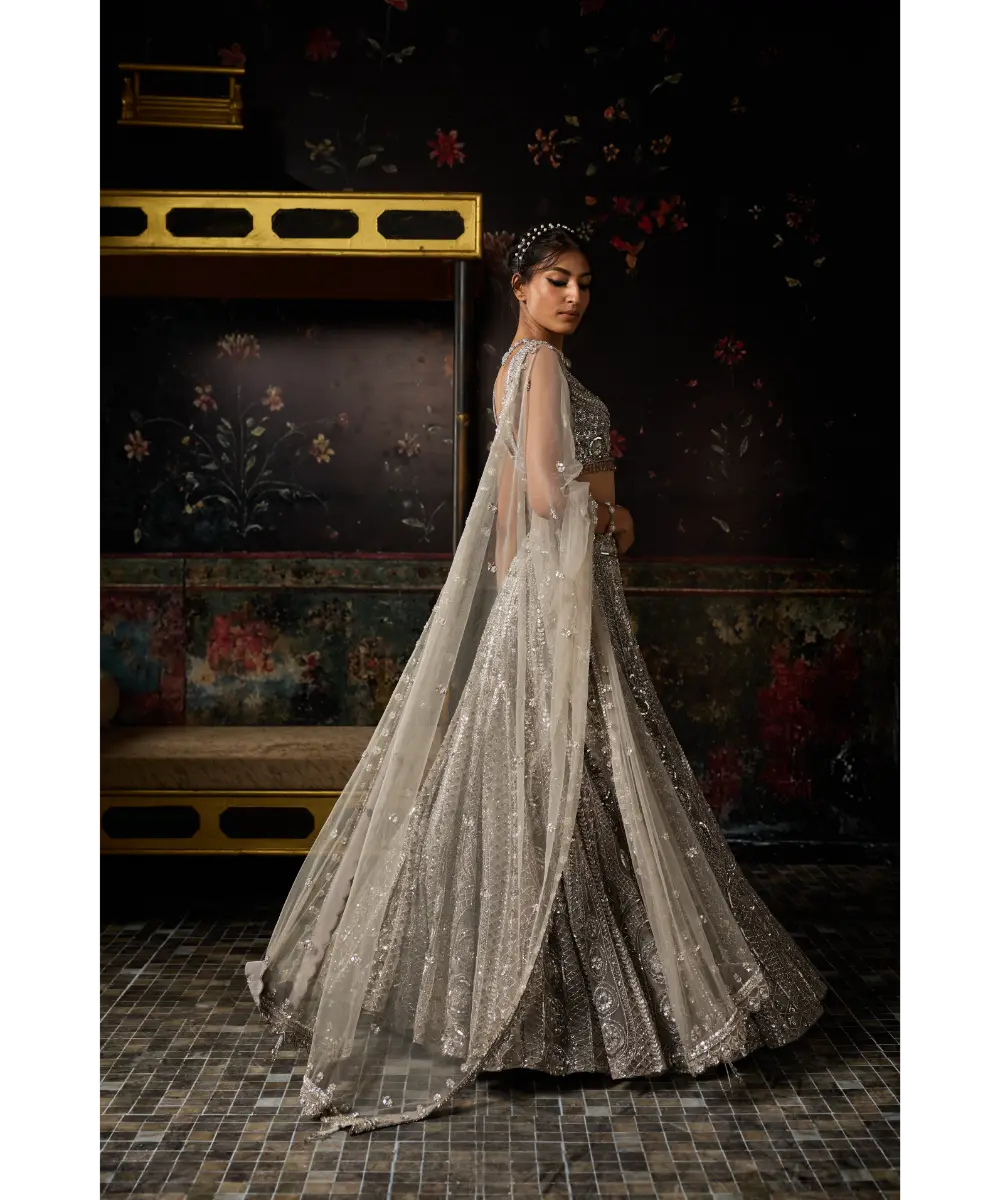 SILVER FULLY EMBELLISHED LONG TRAIL LEHENGA SET