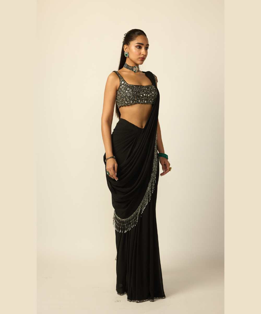 Black Georgette Tassel Draped Saree with Cascading Silver Tassels paired with a heavily Cutdana and Mirror Embroidered blouse. - Vvani vats