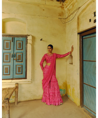 Featuring a Rani pink printed sharara saree in Dupion silk. It is paired with a printed Dupion silk, hand embroidered blouse.
