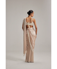 VVANI VATS- Light Beige mirror and pearl Satin Draped Saree set - XS