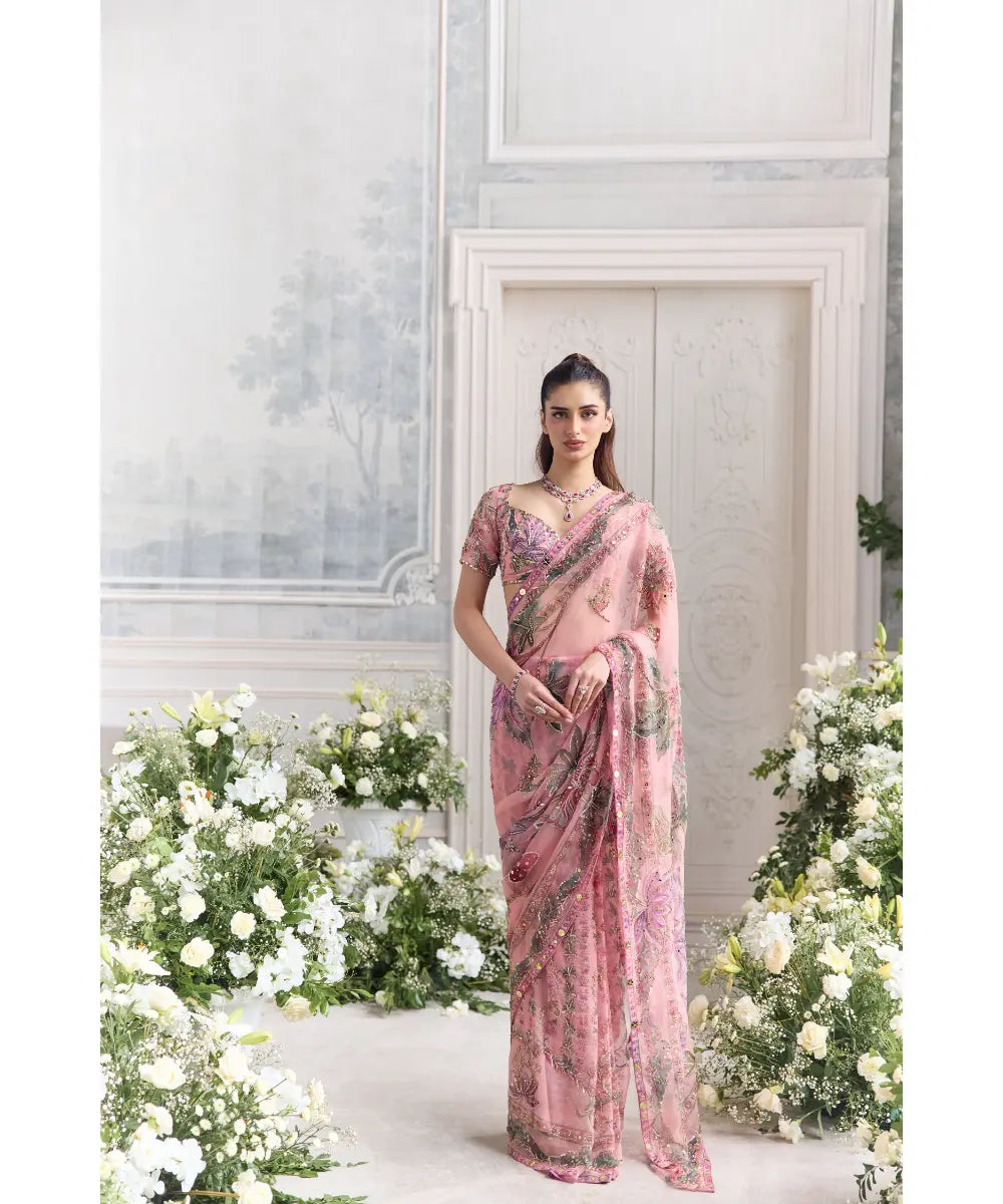 EMBROIDERED CHOLI CUT BLOUSE PAIRED WITH EMBROIDERED PREDRAPED SAREE