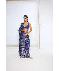 Introducing our pure silk zari saree in deep blue, handwoven over hours in the traditional Kadhwa Banarasi technique. Designed in bold, zebra-inspired stripes and finished with silver zari, it is lightweight, fluid, and perfect for festivities or special occasions.