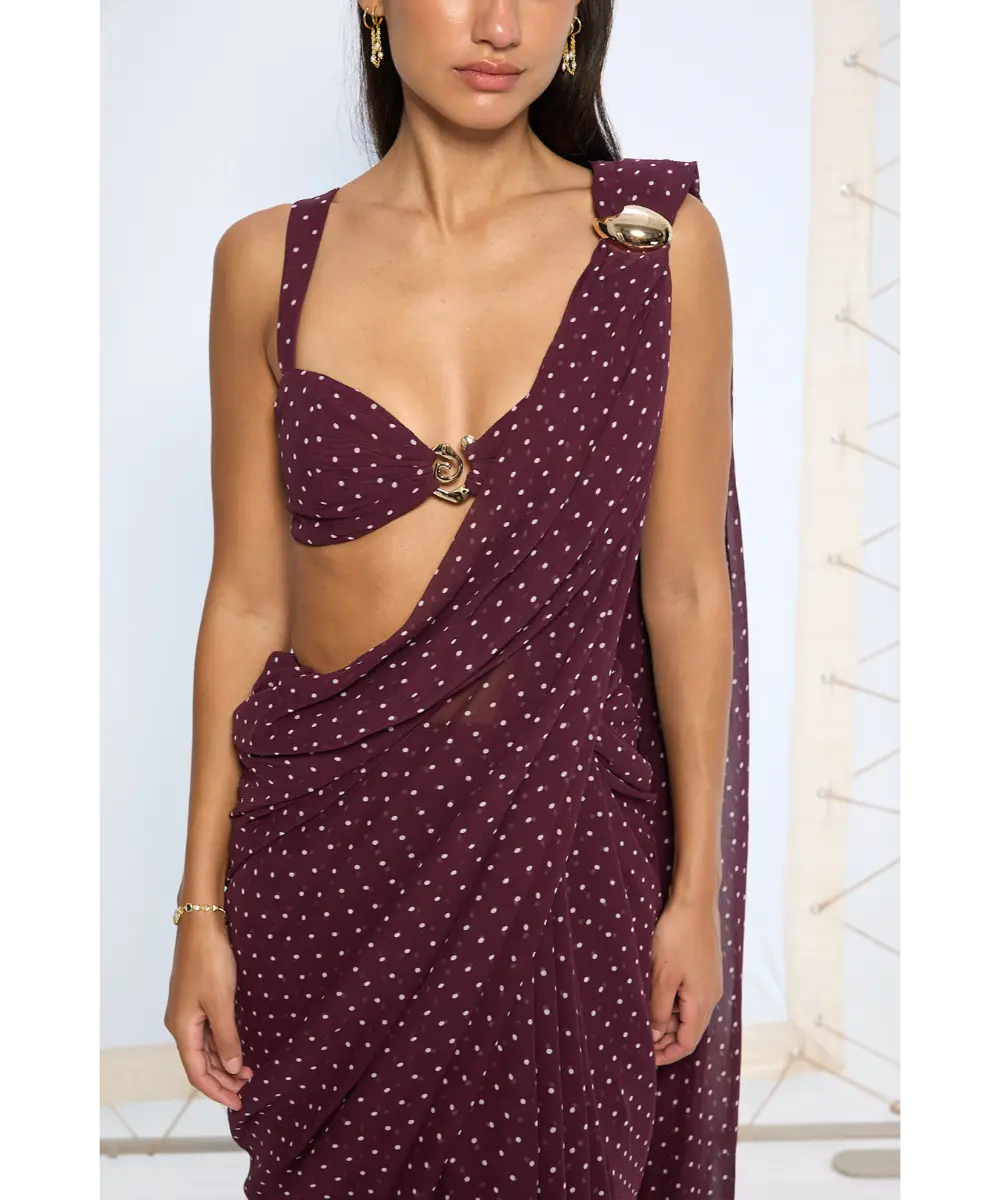 Our maroon pure chiffon saree comes with an all-over white polka dot pattern. Lightweight and fluid, it’s designed to move with you—making it the perfect canvas for both ease and expression. A signature gold hardware brooch at the shoulder lets you pin your pallu in place or reimagine your drape entirely, lending the saree a hint of function and flair.